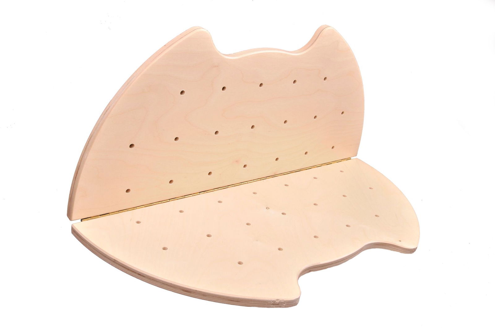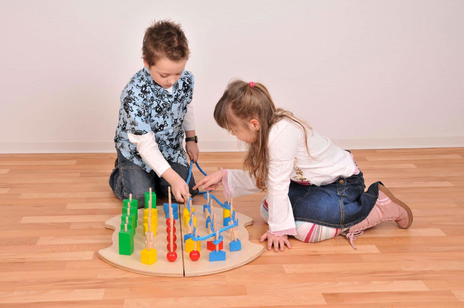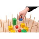 Spielablauf: Das Spielbrett wird aufgeklappt und auf dem Tisch oder dem Boden platziert. Es werden die Holzstäbe in die dafür vorgesehenen Löcher gesteckt. Anschließend können die Holzklötzer beliebig auf die Stäbe gesteckt werden und dadurch Muster entstehen lassen.