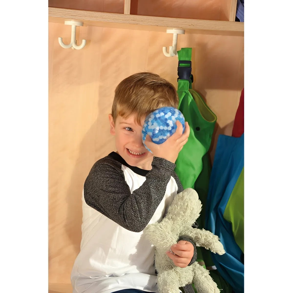 - Ablenkung und Beruhigung: Während die Kühle wirkt, lenken die bunten, sich bewegenden Kügelchen im Inneren das Kind ab. Das visuelle Schauspiel und das angenehme Gefühl beim Knautschen helfen, den Schreckmoment schnell zu vergessen.