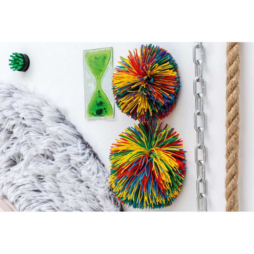 Gerade in belebten Gruppenräumen bietet die Wand einen Ankerpunkt. Die Beschäftigung mit den sensorischen Elementen wie der Geluhr oder den Spinnenbällen kann eine beruhigende Wirkung haben und hilft Kindern, sich zu regulieren und zur Ruhe zu kommen. - Robuste Vielfalt auf kleinem Raum