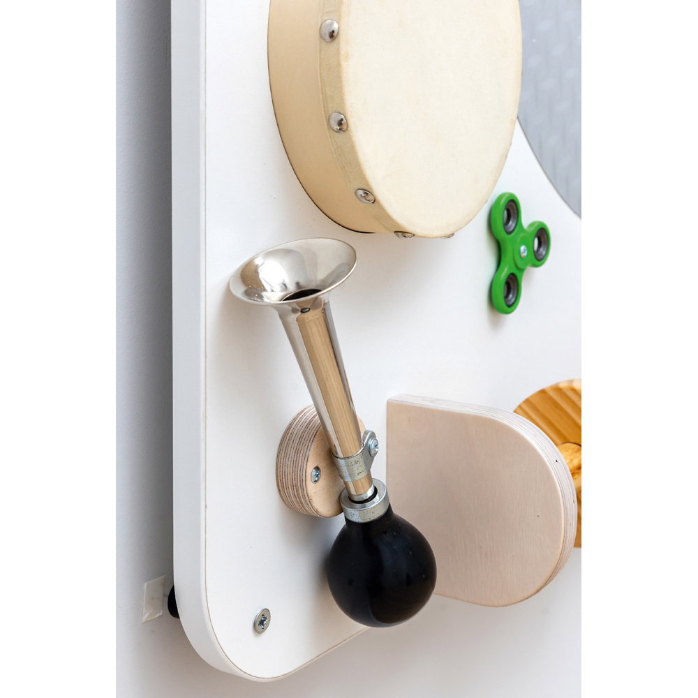 Viele Elemente fordern die Geschicklichkeit heraus. Das Öffnen und Schließen von Reißverschlüssen, das Drehen von Rädchen oder das Betätigen von Schaltern verlangt präzise Fingerbewegungen. Spielerisch trainieren die Kinder so wichtige Greifarten und koordinative Fähigkeiten, die sie im Alltag dringend benötigen. - Akustische Reize zur Förderung des Hörsinns