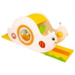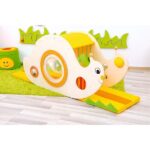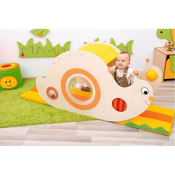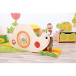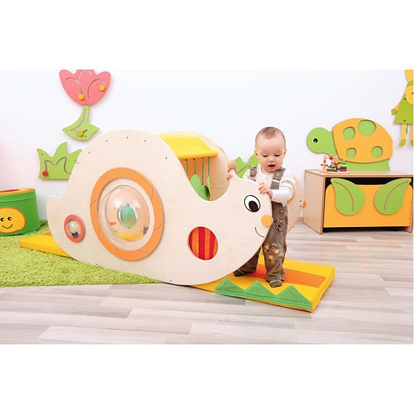 Die freundliche Schnecke bietet eine kleine Welt zum Entdecken und Ausprobieren für die Kleinsten, mit einer Fülle an Elementen zur Sinnesanregung und Entwicklung motorischer Fähigkeiten. Die Kinder begegnen unterschiedlichen Materialien und Oberflächen zum Ertasten und Fühlen; die Blätter am Dach der Schnecke erzeugen bei Bewegung leise Glockentöne; Schiebespiele und andere bewegliche Teile fördern die Feinmotorik und Kreativität; kräftige, kindgerechte Farben und einfache Formen unterstützen den Lerneffekt. Mit weicher Matte als Unterlage.