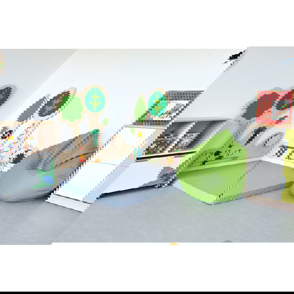 Die Spielwand besteht aus stabilem Sperrholz und ist mit einem umweltschonenden Acryllack auf Wasserbasis behandelt. Dieser ist von Anfang an frei von schädlichen Ausdünstungen. Die fest montierten Elemente können nicht verloren gehen und halten dem lebhaften Spielalltag in Gruppenräumen stand. - Platzsparende Lern- und Spielumgebung