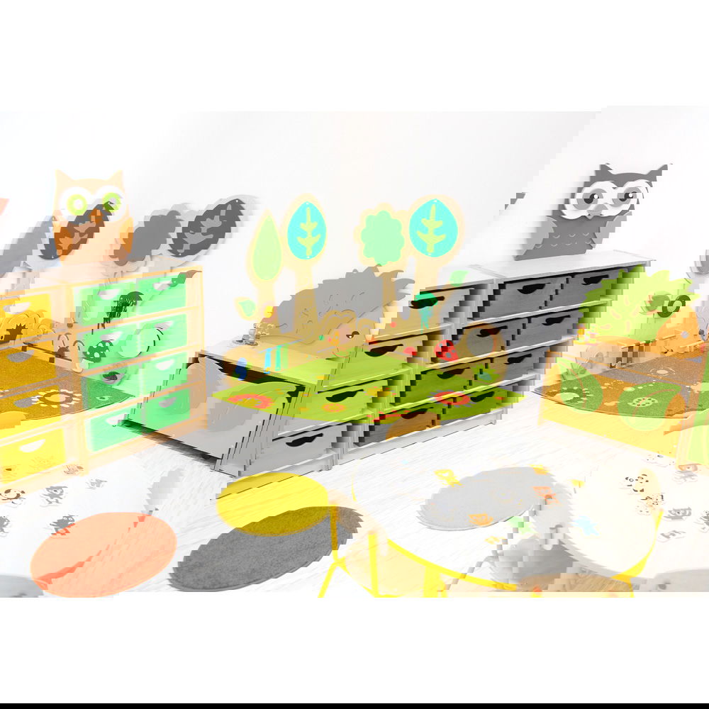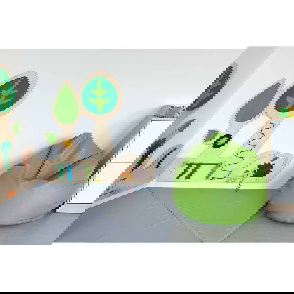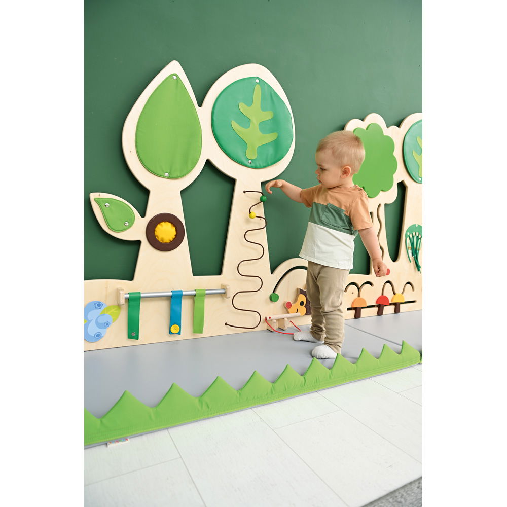 Das Design entführt Kinder in eine zauberhafte Waldlandschaft. Die Baumkronen aus Kunstleder können per Druckknopf befestigt werden und laden zum Tasten ein, während der freche Raspel-Igel und die Quietsche für akustische Überraschungen sorgen. Jedes Element wurde sorgfältig ausgewählt, um die Neugier zu wecken und eine umfassende, entwicklungsgerechte Förderung zu ermöglichen. Diese Wand ist nicht nur eine Dekoration, sondern ein aktives Werkzeug, das Kinder dazu anregt, ihre Umgebung selbstständig zu erforschen.