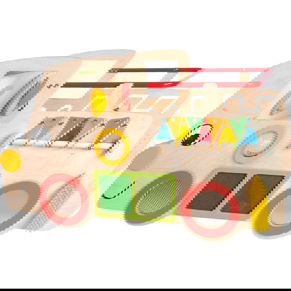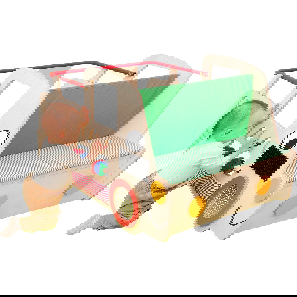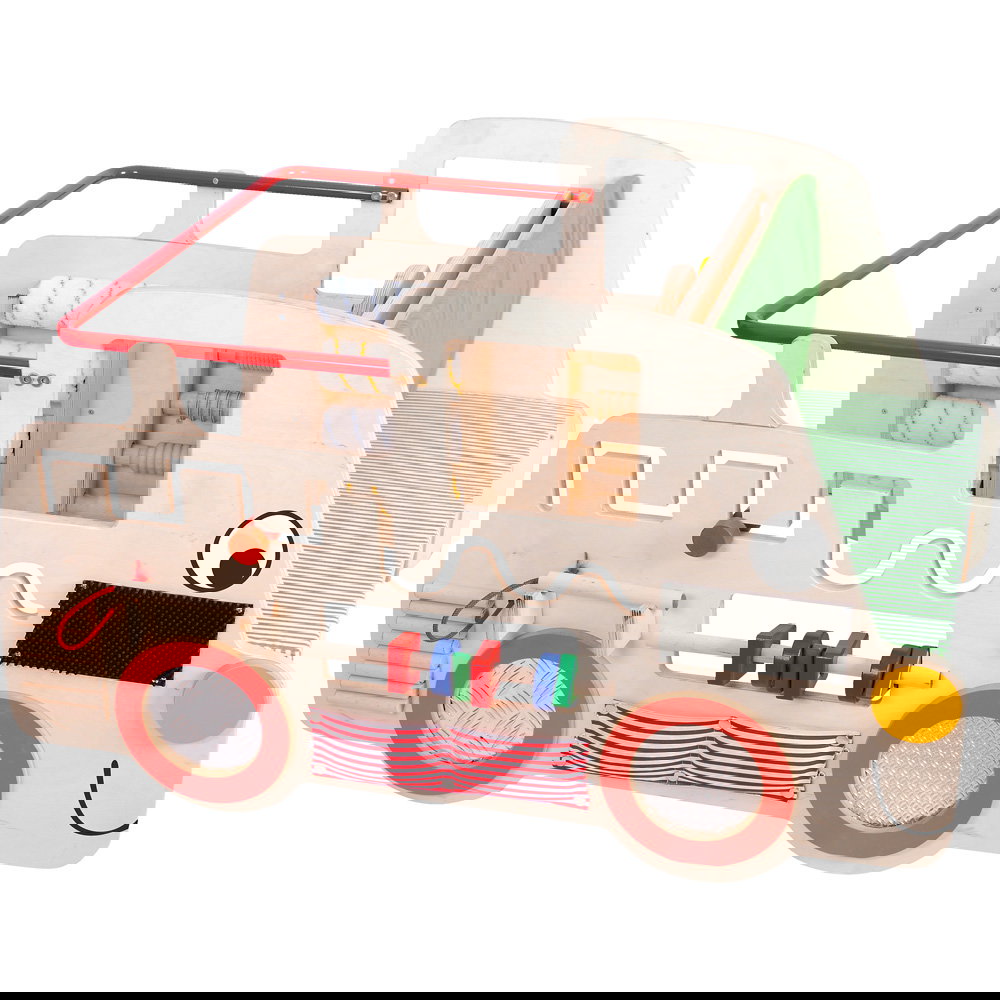 Die stabile Konstruktion aus hochwertigem Sperrholz ist rundum mit einer Fülle an aufregenden Elementen ausgestattet. An den Seiten und auf der „Motorhaube“ warten zahlreiche haptische und visuelle Reize darauf, von kleinen Händen erforscht zu werden. Verschiedene Materialien und Oberflächen, bewegliche Schiebespiele und drehbare Teile machen das Auto zu einem interaktiven Erlebnis. Wer von der aufregenden Fahrt eine Pause braucht, kann auf der integrierten Sitzbank Platz nehmen, sich ausruhen oder das bunte Treiben beobachten.