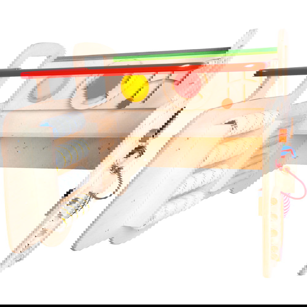- Zahlreiche sensomotorische Spielelemente (Schiebespiele, bewegliche Teile, verschiedene Oberflächen)