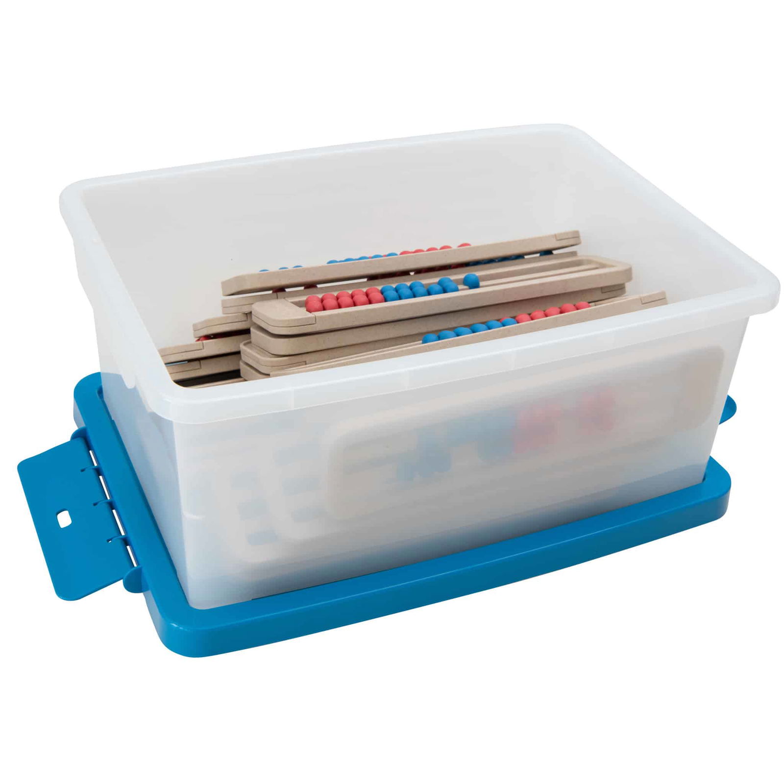 Das Set enthält eine praktische Aufbewahrungsbox, die den Rechenrahmen optimal schützt. Die Box hat die Maße Höhe: 16 cm, Breite: 39,5 cm, Tiefe: 27,5 cm und bietet viel Platz, um alle Materialien ordentlich aufzubewahren. Die Stabilität des Deckels sorgt dafür, dass der Inhalt auch auf Reisen gesichert ist.