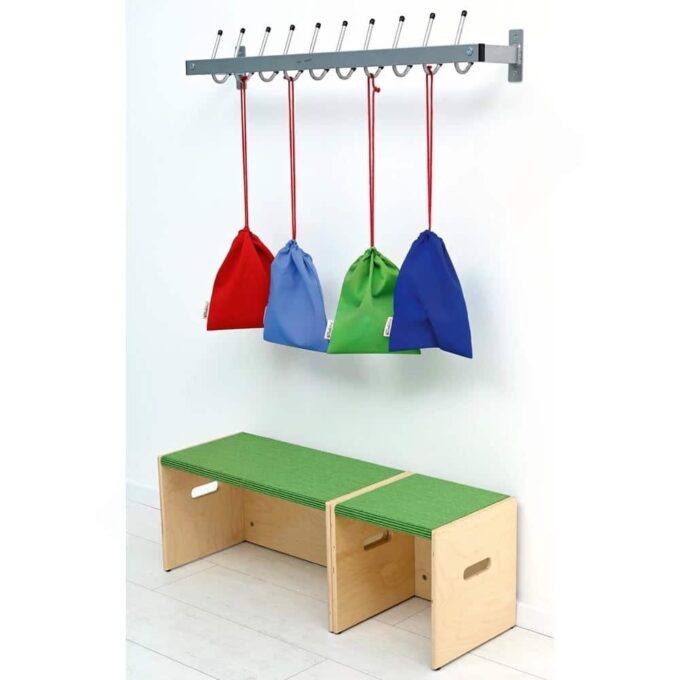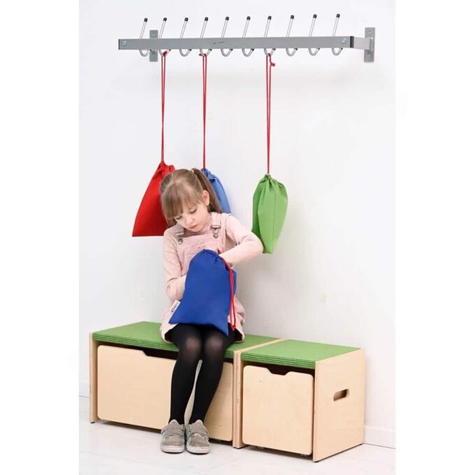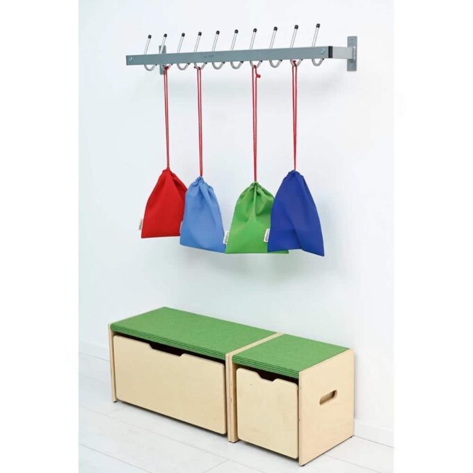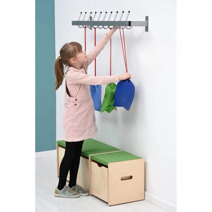 Optimieren Sie Ihre Aufbewahrungslösung mit unserer Sicherheitsgarderobenleiste aus Metall! Diese robuste Leiste ist mit 10 rückseitig verschweißten Doppelhaken ausgestattet, die zur Wand zeigen und somit die Verletzungsgefahr minimieren. Perfekt für Schulen, Kindergärten und Büros, wo eine sichere und praktische Aufbewahrung erforderlich ist.