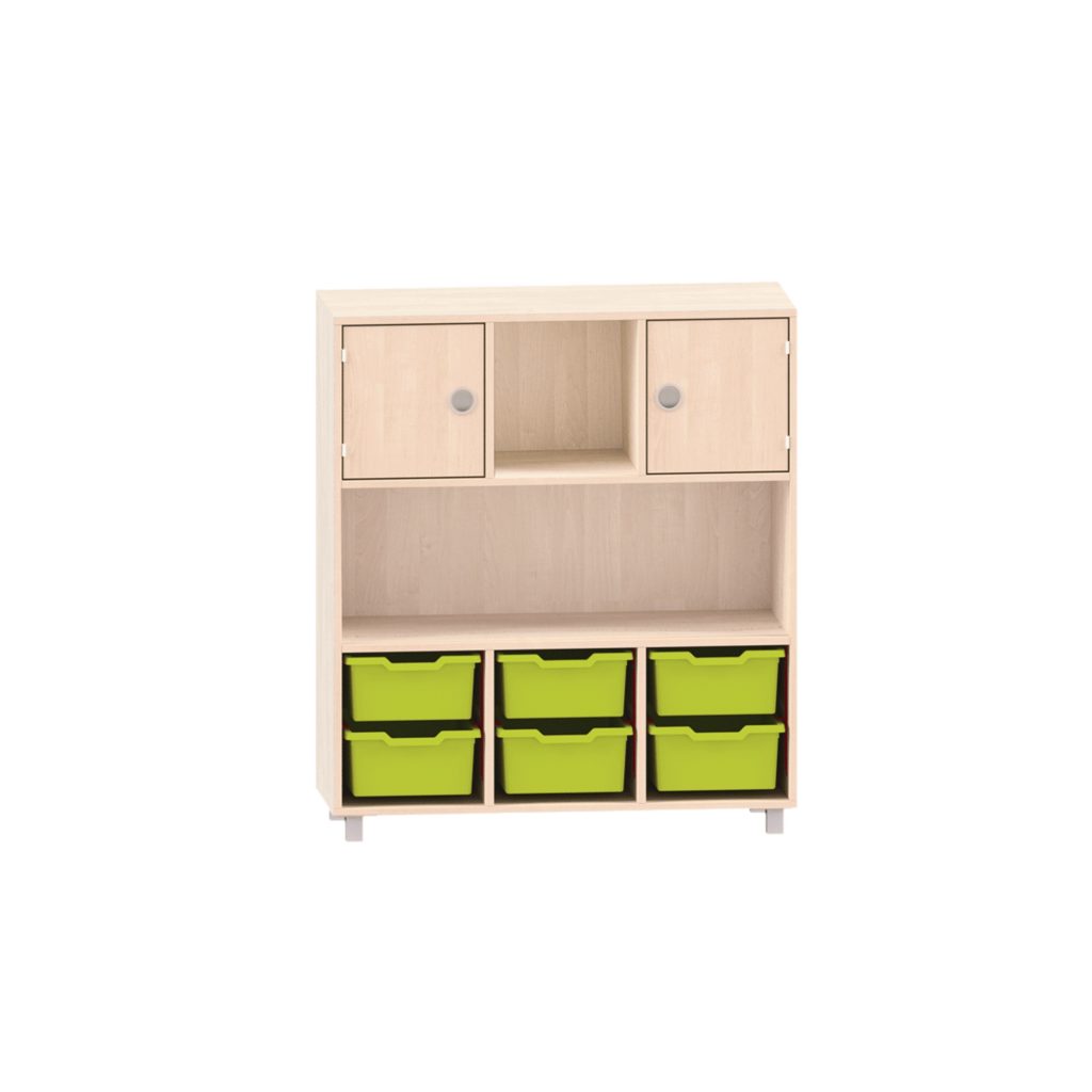 Sideboard mit 2 Böden, oben 2 Türen links und rechts, mittig frei und unten 6 ABS-Boxen für Kitas & Schulen