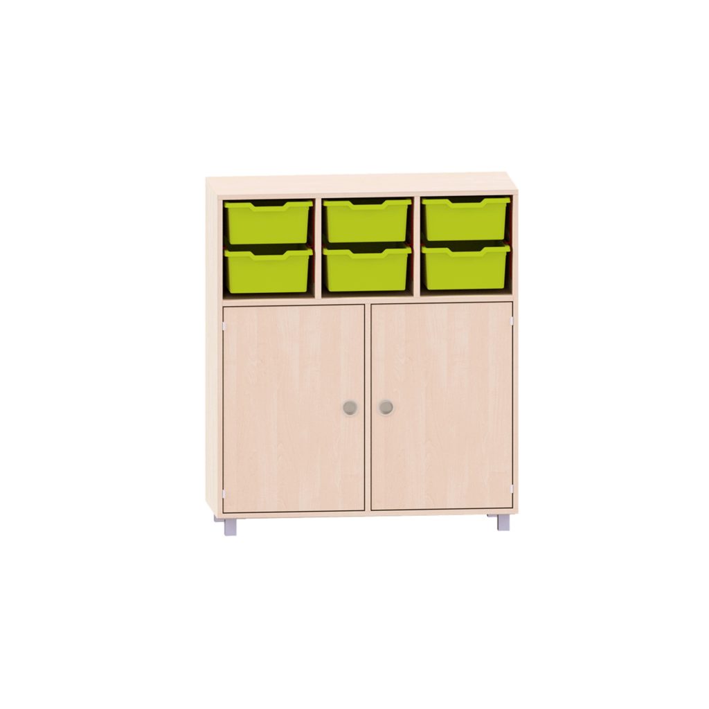 Sideboard mit 2 Böden, oben 6 große ABS-Boxen und unten 2 Türen für Kitas & Schulen