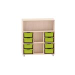 Sideboard mit 2 Böden, oberes Fach frei, unten links und rechts jeweils 4 ABS-Boxen, mittige Fächer frei für Kitas & Schulen