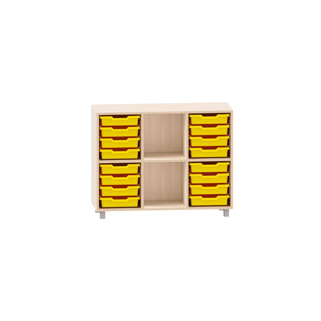 Sideboard mit einem Boden, 8 ABS-Boxen rechts und 8 ABS-Boxen links, mittiges Fach frei für Kitas & Schulen