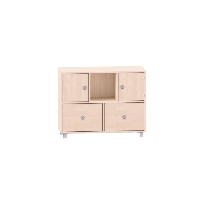 Sideboard mit einem Boden, oben links und rechts Türen, Mitte freies Fach und unten zwei Schubkästen für Kitas & Schulen