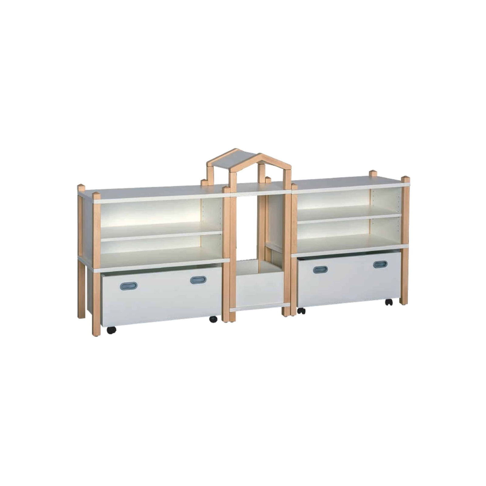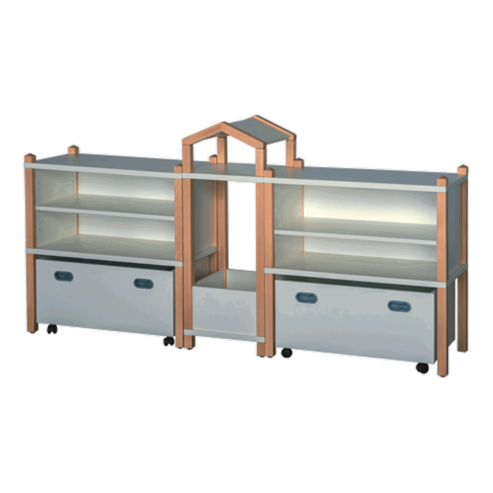 - Offener Stauraum für den schnellen Zugriff: Zusätzlich zu den Rollkästen bietet das System vier offene Regalfächer. Hier finden Bücher, Puzzles oder kleinere Spiele ihren festen Platz und sind für die Kinder stets gut sichtbar und erreichbar.
