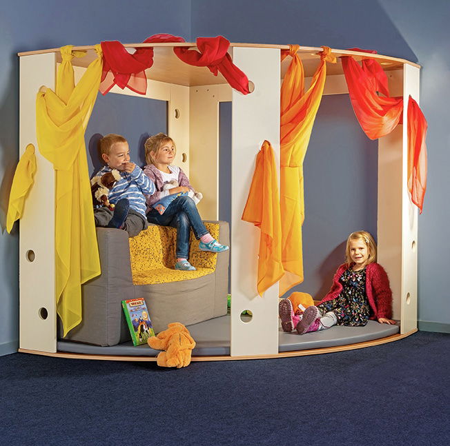 Ein gemütlicher Rückzugsort zum gemeinsamen Entspannen und Kuscheln. Durch die Lochbohrungen an der Oberplatte sowie an den Stützelementen können Vorhänge, Schwungtücher oder Girlanden frei nach Wunsch angebracht werden. Der Viertelkreis wird komplett aus Birke Multiplex gefertigt. Die Lieferung erfolgt ohne die abgebildeten Tücher und Sitzelemente. Viertelkreismatte bitte separat bestellen.