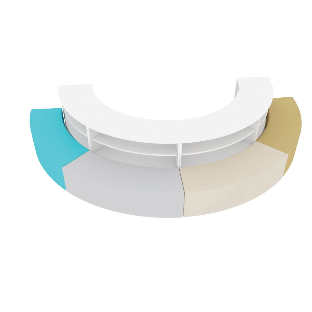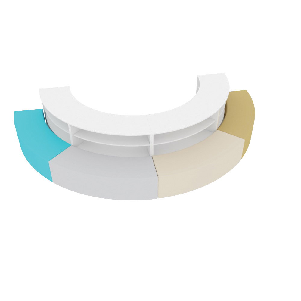 Die vier Achtelkreis-Schränke stehen auf stabilen Beinen und kommen komplett ohne Rückwand aus. Dadurch sind die fest integrierten weißen Fachböden von beiden Seiten bequem zugänglich. Die Kinder können Spielsachen oder Bücher ganz einfach entnehmen und wieder aufräumen. Die Schrankkombination dient zudem als hervorragender, halboffener Raumteiler, der große Gruppenräume natürlich strukturiert. - Großzügige Sitzgelegenheiten an der Außenseite