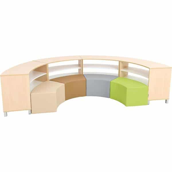 Der rückwandlosen Schränke sind von beiden Seiten zugänglich und lassen sich hervorragend zu Raumteilern kombinieren. Sitze Paolo, die innen bzw. außen angestellt werden, bieten zusätzlichen Platz zum Sitzen, Lesen, Kleingruppenaktivitäten und Ausruhen.