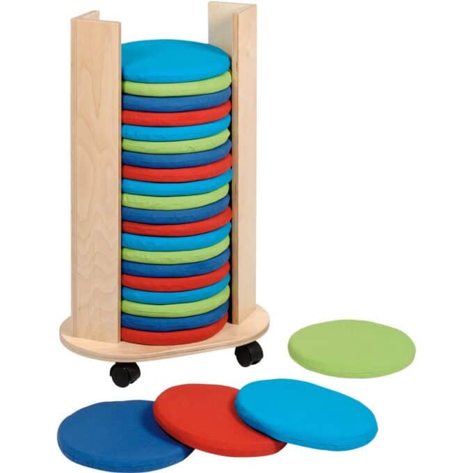 Jedes Kind hat seinen eigenen, klar definierten Platz. Nach der Benutzung können die Kissen von den Kindern selbstständig aufgeräumt werden, idealerweise im passenden Sitzkissenwagen. Dies fördert das Verantwortungsbewusstsein und etabliert einfache, aber wichtige Ordnungsrituale im Gruppenalltag. - Zwei Set-Größen für jeden Bedarf