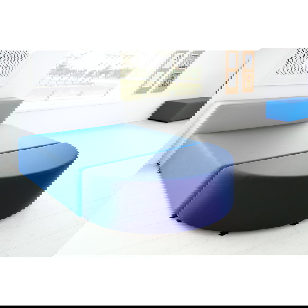 - Einladende Formensprache: Die Kombination aus quadratischen und halbrunden Elementen lockert starre Raumstrukturen auf und lädt zum Verweilen ein.
