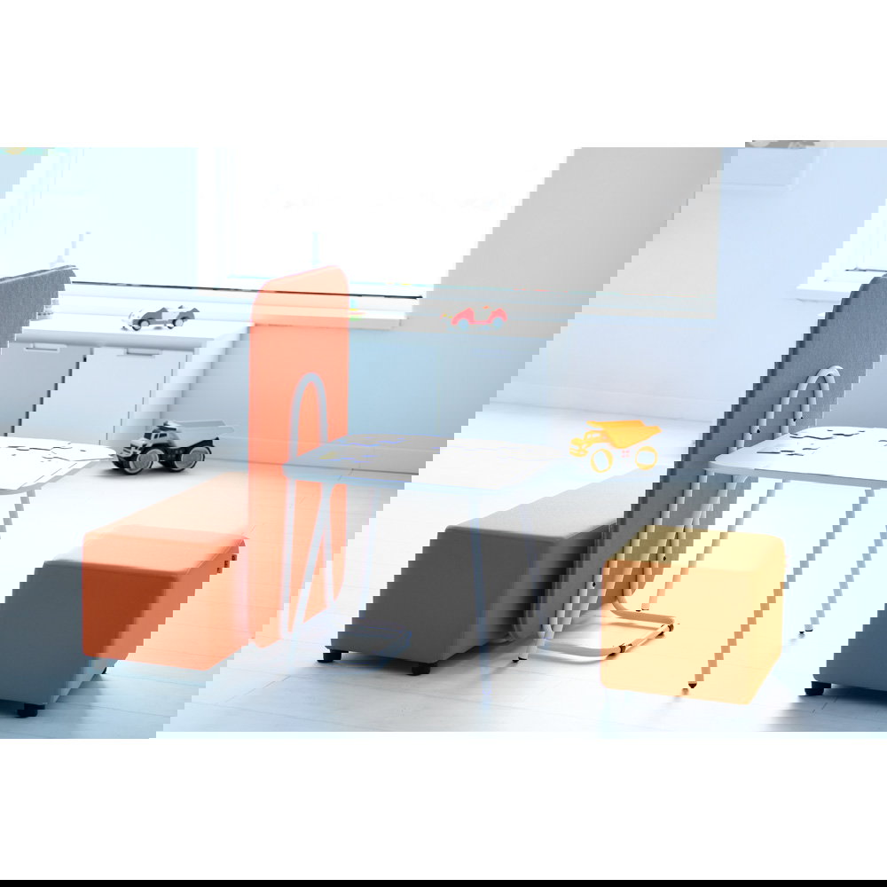 Das durchdachte Arrangement umfasst zwei bequeme Sitzelemente und einen stabilen, weißen Tisch mit vier Beinen (50 Zentimeter Höhe, 60 x 60 Zentimeter Tischplatte). Hier finden Kinder den idealen Platz für kreative Bastelprojekte oder fokussiertes Lernen. Um diesen Bereich optisch und akustisch vom restlichen Raumgeschehen abzuschirmen, wird das Set durch eine orangefarbene Trennwand komplettiert. Das integrierte Schalldämmvlies schluckt störende Umgebungsgeräusche effektiv und erschafft so eine spürbar beruhigte Atmosphäre. Die lebendigen Farbvarianten Senf und Orange fügen sich dabei harmonisch in jedes zeitgemäße, geradlinige Raumkonzept ein.