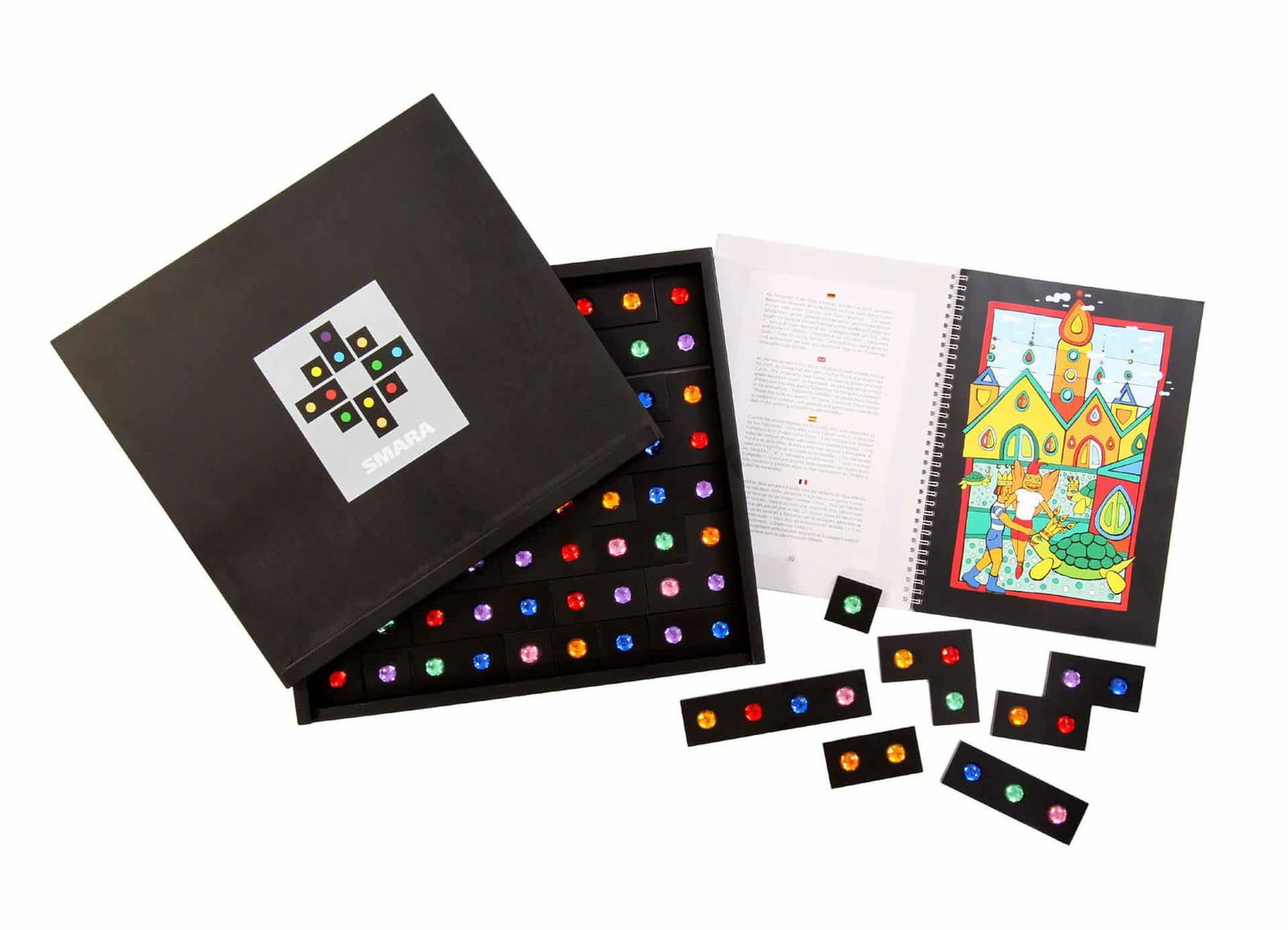 Mit seinen zahlreichen Komponenten bereitet das Smara-Spiel bereits Kindern im Kindergartenalter bis hin zu älteren Schülern in der Schule oder im Hort bei jedem Zug Freude. Die farbenfrohen Holzsteine, verziert mit Acrylsteinen in Regenbogenfarben, eröffnen eine Fülle an Spielmöglichkeiten für Einzelspieler oder Gruppen von bis zu fünf Teilnehmern. Insgesamt sechs verschiedene Steinformen, darunter Winkel und Rechtecke, sind zusammen mit der Spieleanleitung und zwei Filzunterlagen in einer ansprechenden schwarzen Holzbox mit Schiebedeckel verpackt, die mit den Maßen 34,8 cm Breite, 38,8 cm Länge und 3,9 cm Höhe kompakt und ordentlich verstaut werden kann.