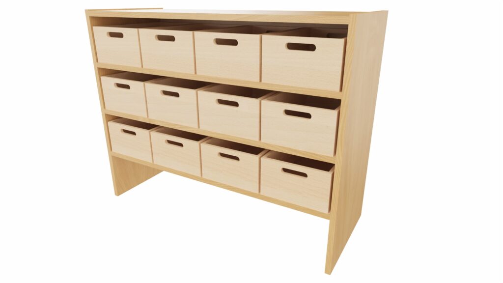 Unsere Sockelnischenschränke sind ideal für die Aufbewahrung und Organisation. Die 12 Materialkästen sind perfekt geeignet, um alles geordnet zu halten, sei es Bastelmaterial, Lernutensilien oder Spielzeug.