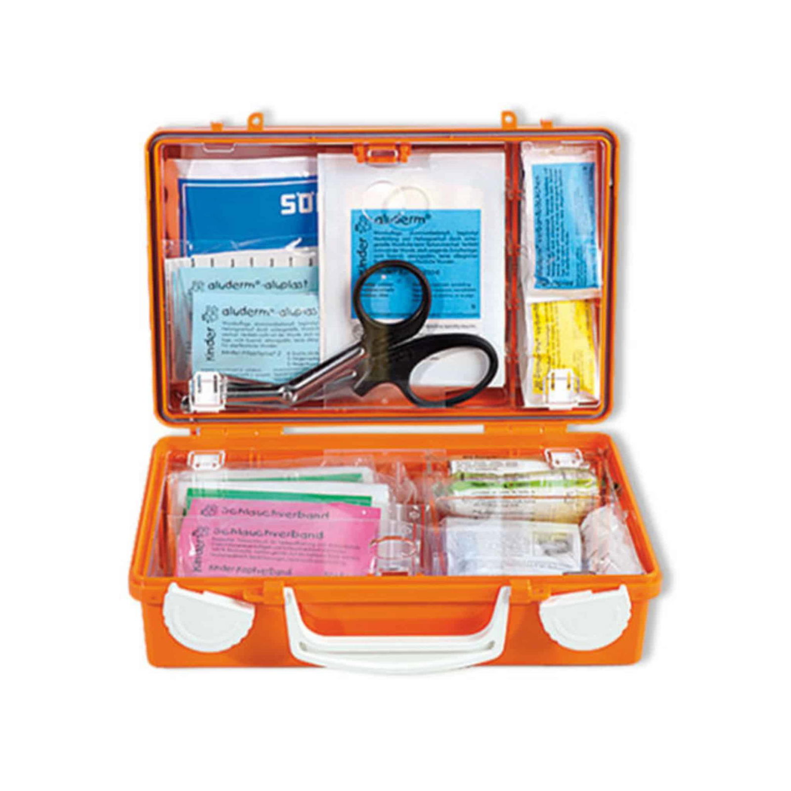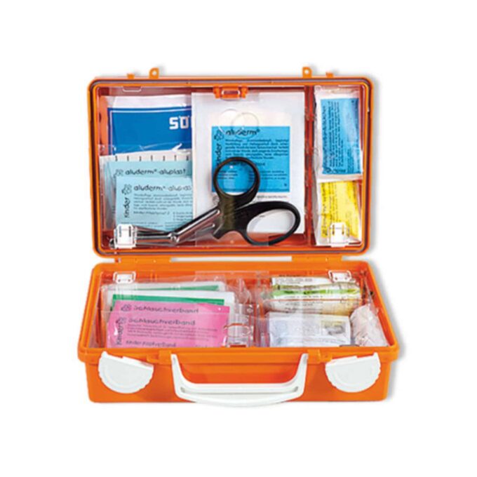 - Enthält u. a. Kinder-Verbandpäckchen, Pflastersets, Kompressen, Schere, Rettungsdecke und Beatmungshilfe.