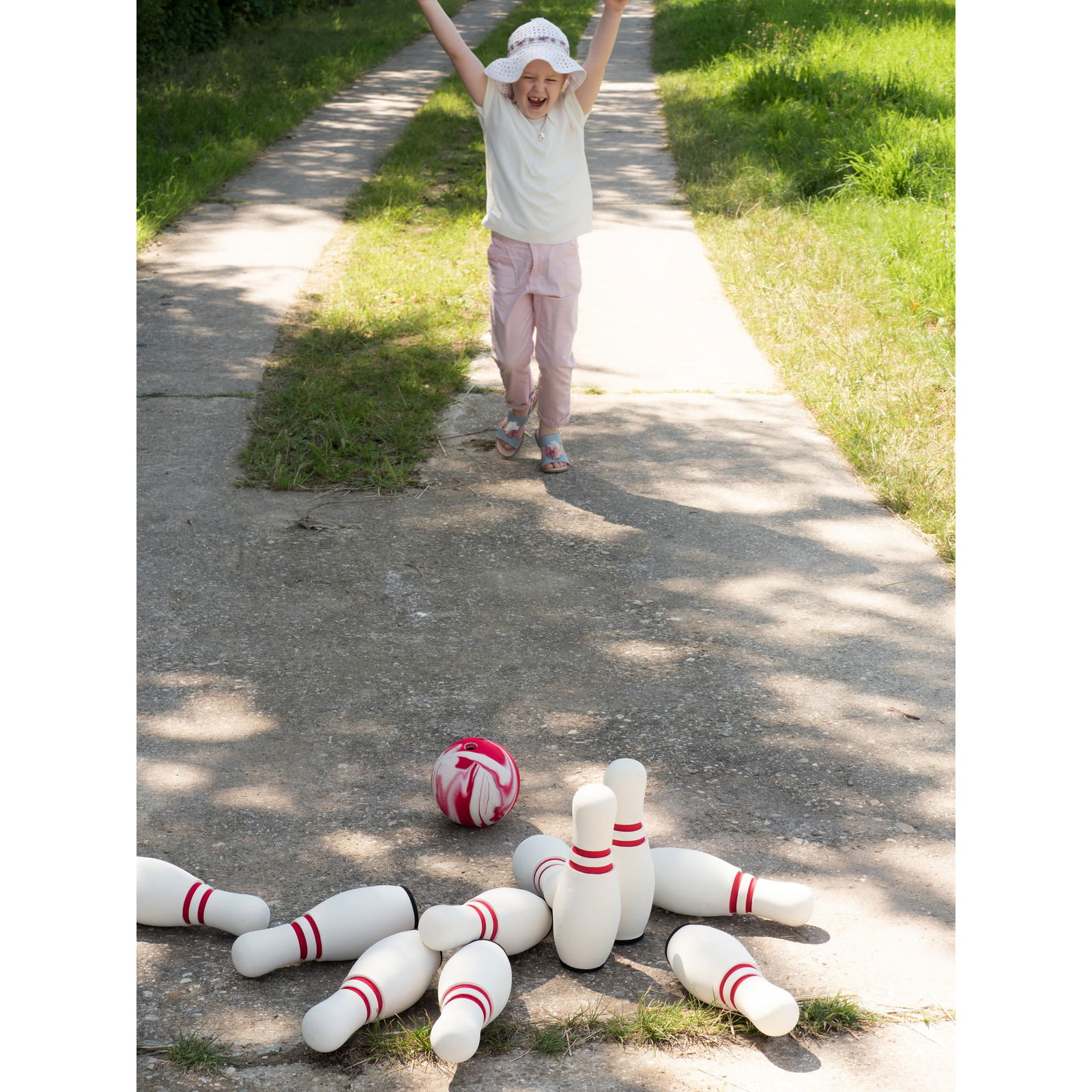 Das Soft-Bowling-Set stellt eine sichere und gefahrlose Variante des klassischen Bowlings dar. Alle Pins und Kugeln sind aus weichem Schaumstoff gefertigt, wodurch das Verletzungsrisiko erheblich reduziert wird. So können die Kinder ohne Sorgen spielen und die Freude am zielsicheren Werfen entdecken. Die Pins sind ganz leicht und wiegen nur etwa 300 g. Die Bowling-Kugeln sind ebenfalls leicht und wiegen ca. 470 g, sodass sie für alle Altersgruppen geeignet sind.
