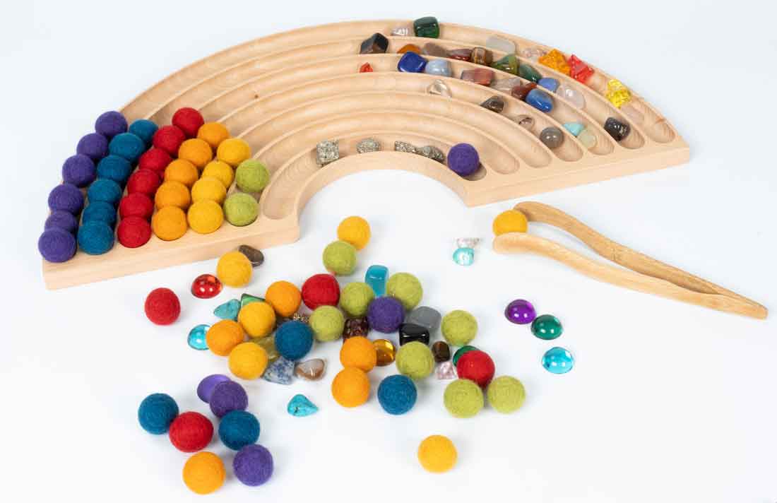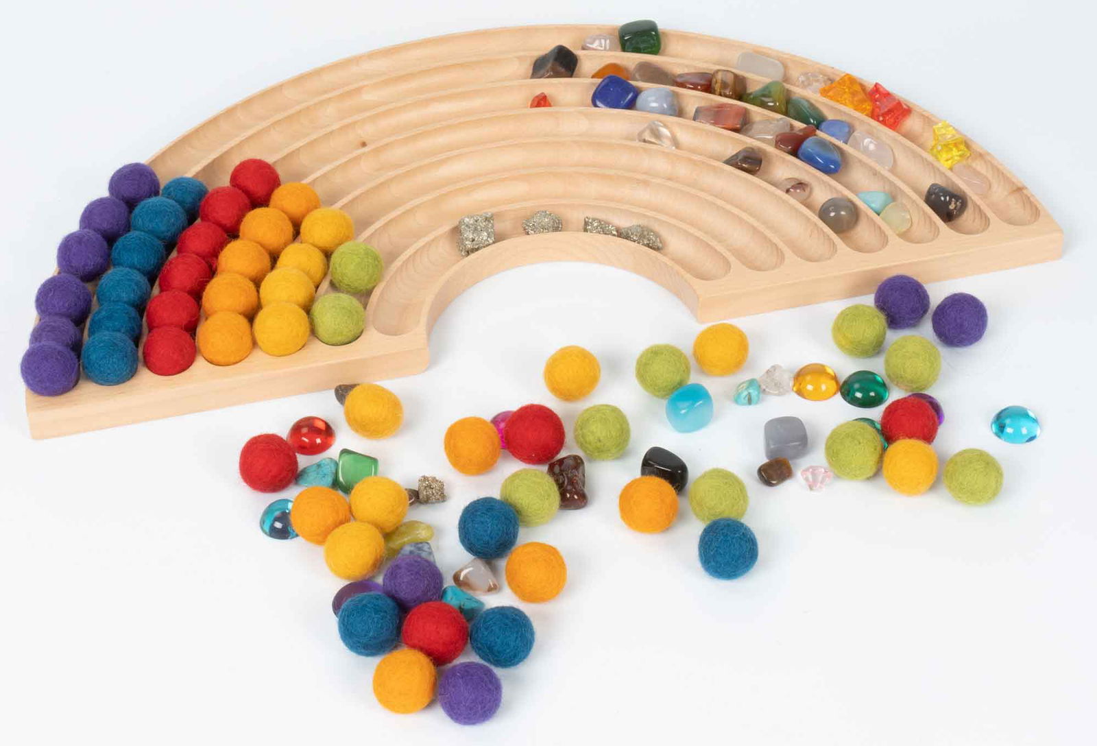Entdecken Sie das Sortier- und Legebrett „Regenbogen“, ein vielseitiges Holzbrett, das die Fantasie und die motorischen Fähigkeiten Ihrer Kinder fördert! Dieses halbrunde Brett ist mit 2 cm breiten Rillen ausgestattet, die sich wunderbar mit verschiedensten Materialien füllen lassen. Ob Filzkugeln, Edelsteine, Murmeln oder andere kleine Gegenstände – die Möglichkeiten sind unbegrenzt!