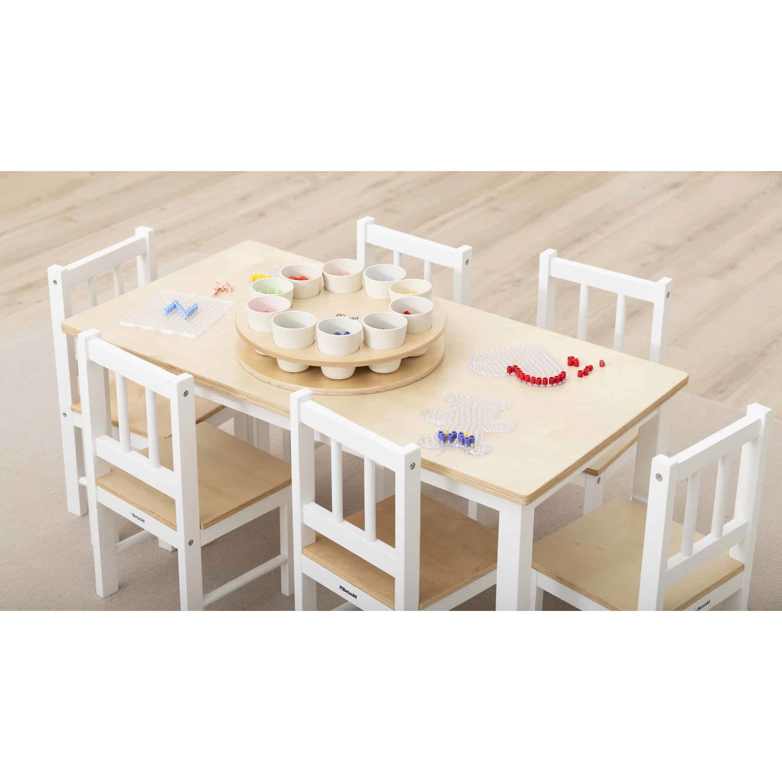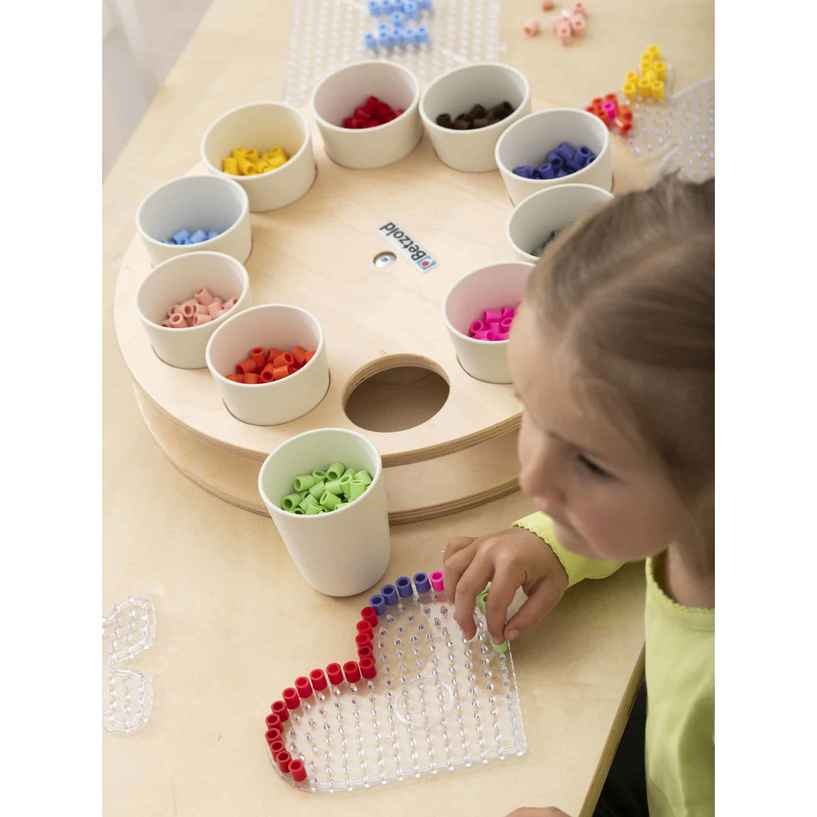 - Das Rondell mit seinen zehn stabilen Bechern bietet Platz für eine Vielzahl an Materialien wie Stifte, Perlen, Bastelutensilien oder kleine Spielsachen.