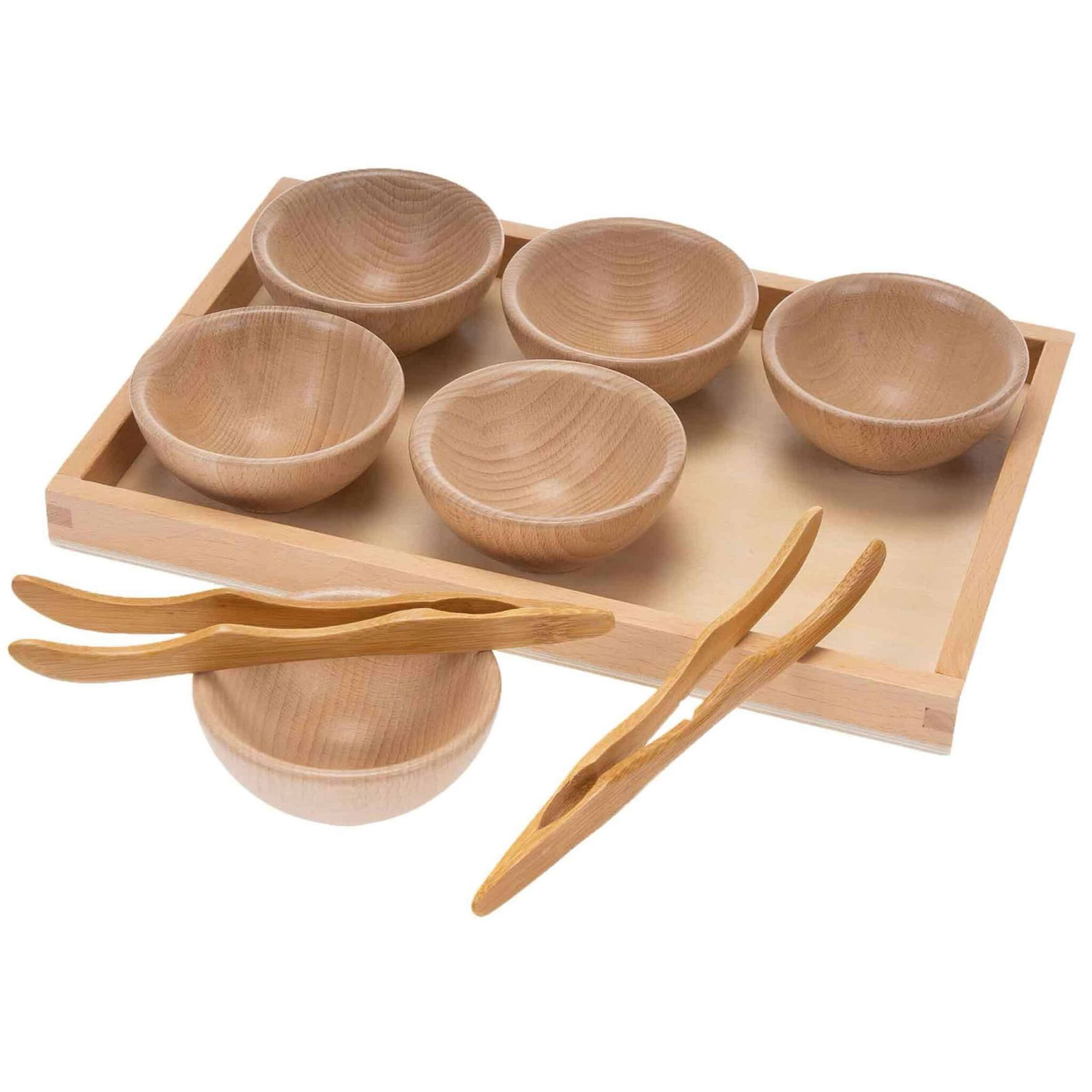 Die schönen Holzschalen mit einem Durchmesser von 9 cm schaffen eine ansprechende und lehrreiche Umgebung. Das gesamte Tablett misst 30 x 20 cm und bietet genügend Platz für verschiedene Sortiermöglichkeiten.