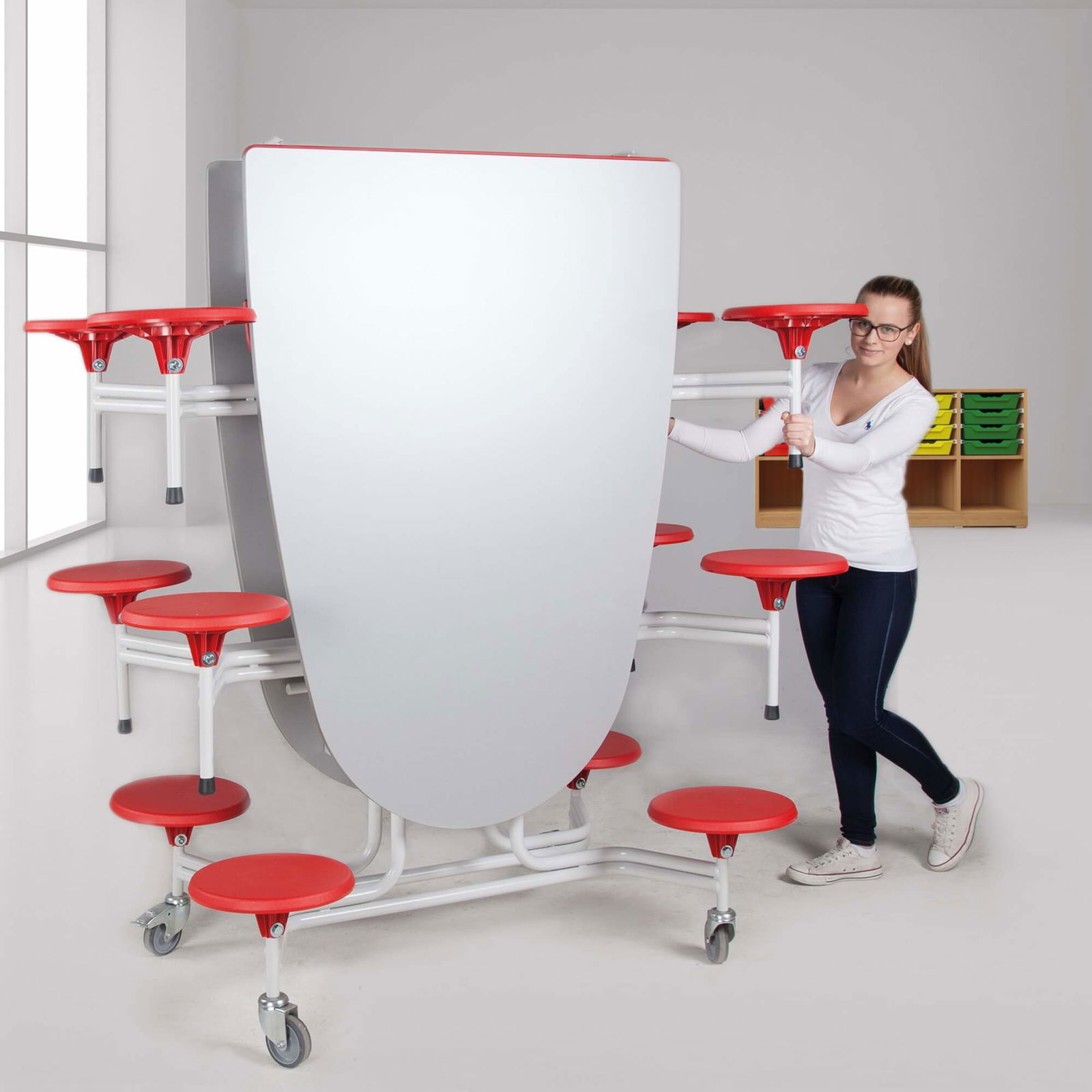Der ovale Klapptisch „Spaceflex 2.0®“ eignet sich ideal als flexible Sitzgelegenheit für Gruppen von bis zu 12 Kindern. So eignet sich der Tisch beispielsweise hervorragend als Esstisch für die Kinder und kann zur gewünschten Zeit leicht auf- und zugeklappt werden, um Platz zu sparen.