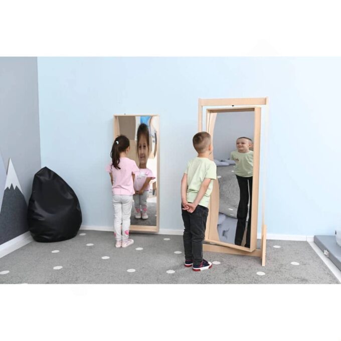 Der Spiegel ist aus nahezu unzerbrechlichem Acryl gefertigt, was für höchste Sicherheit sorgt, selbst in lebhaften Kindergruppen. Der robuste Rahmen aus laminierter Spanplatte und das stabile Gestell machen ihn zum langlebigen Begleiter in Kindergärten, Schulen oder auch im heimischen Spielzimmer. Sein cleveres Design erlaubt es, den Spiegel um die eigene Achse zu drehen, sodass beide Seiten des Spiegels leicht zugänglich sind – für maximalen Spaß und Flexibilität.
