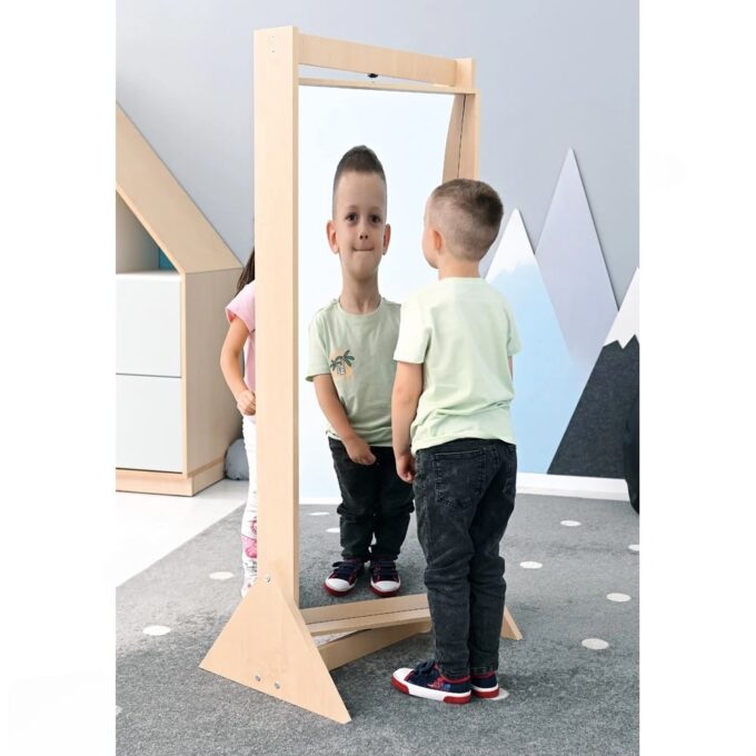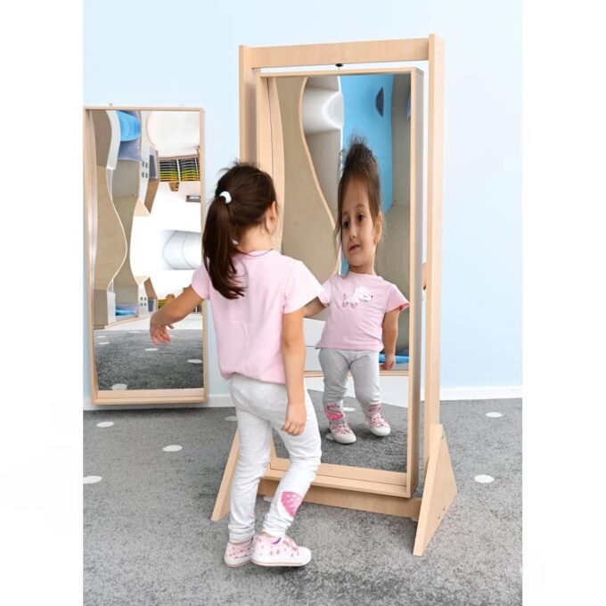Der Spiegel mit Gestell, Welle ist weitaus mehr als nur ein funktionales Accessoire – er bietet Kindern eine spielerische Möglichkeit, ihre Wahrnehmung auf vielfältige Weise zu erkunden. Die wellenförmigen Verformungen des Spiegels werfen lustige, verzerrte Reflexionen zurück, die nicht nur faszinieren, sondern Kindern auch dabei helfen, die Welt und sich selbst aus neuen Perspektiven zu erleben. Diese Interaktionen fördern spielerisch die Kreativität und den Entdeckungsgeist der Kleinen.