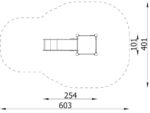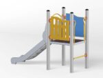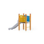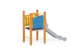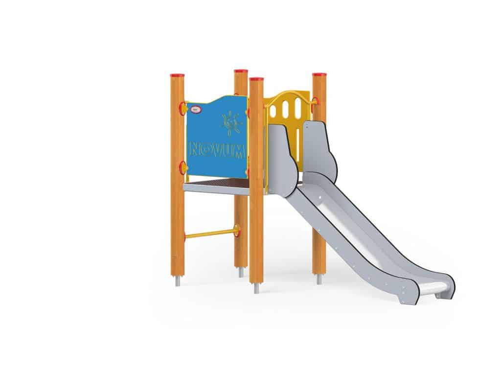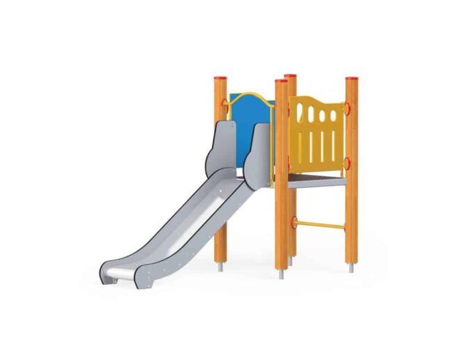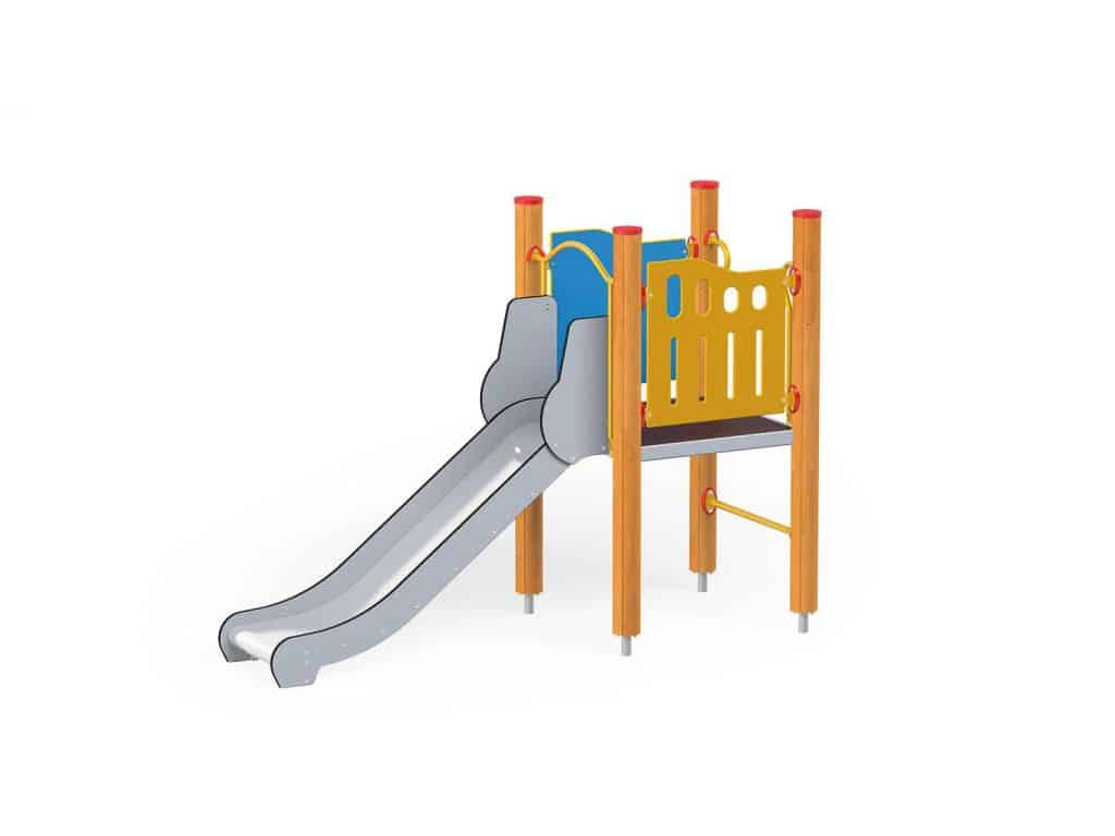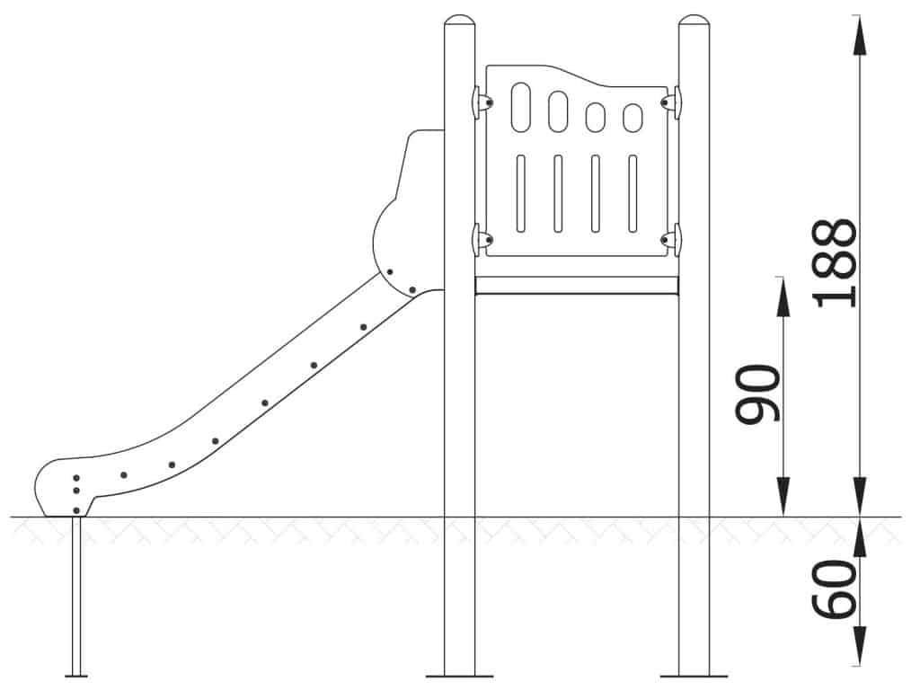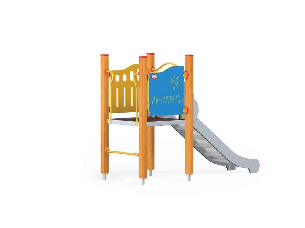 1 quadratische Plattform, 1 Rutsche 104, 2 Sicherheits-HDPE-Platten mit dekorativen Schnitten, 4 Metallbeschläge zum Einbau in den Boden. Dieses Gerät ist auch mit feuerverzinkten Pfosten erhältlich.