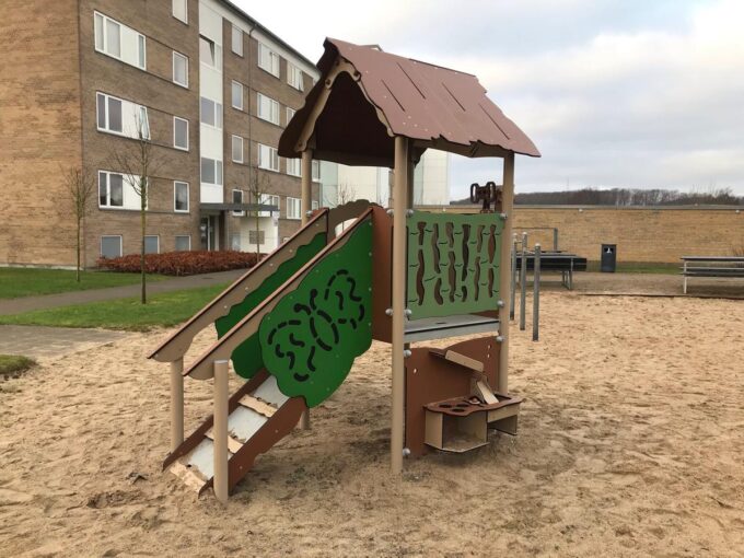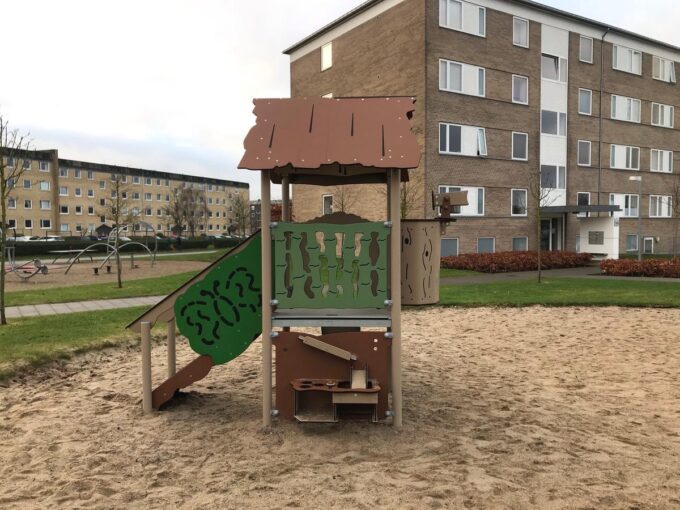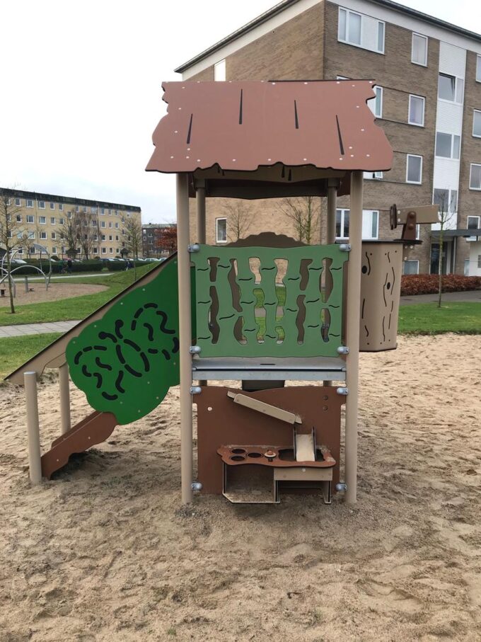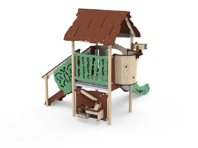 Atox hat eine Bodenhöhe von 90 cm. Die Spielanlage ist mit einem Dach ausgestattet, das Kindern den Eindruck vermittelt, sie wären in einer Hütte und einem Spielhaus. Das Dach schützt vor Wind und Wetter und spendet zudem Schatten. Auf Bodenhöhe befindet sich die Küche, die sich dank imaginärer Töpfe und Pfannen bestens für Rollenspiele eignet. Was wollen wir backen? Und wann essen wir?