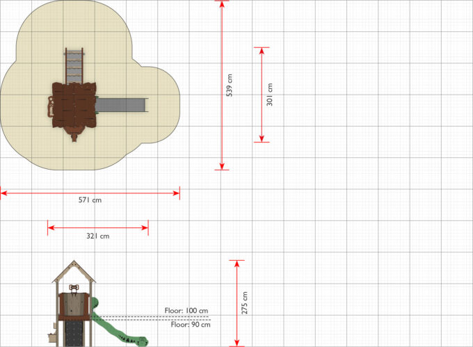 - Platzbedarf inkl. Sicherheitsabstände (LxB): 571 x 539 cm