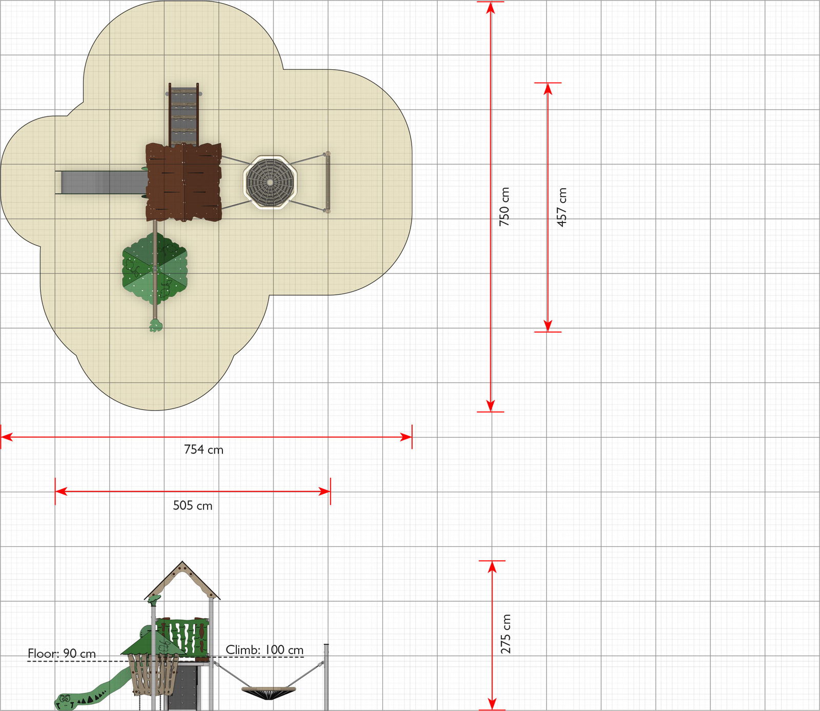 - Platzbedarf inkl. Sicherheitsabstände (LxB): 754 x 750 cm