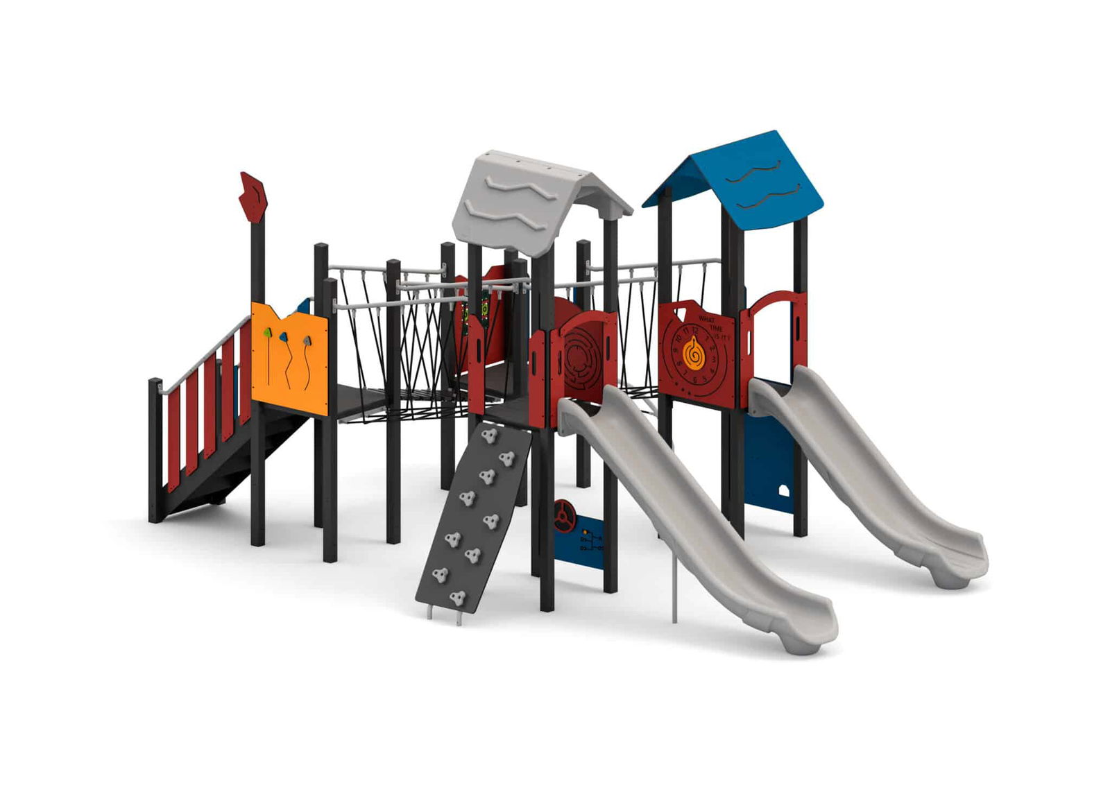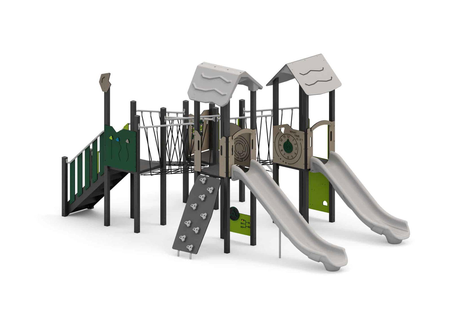 - Produktname: Spielanlage mit 2 Rutschen, Netz- und Plankenbrücke, Kletterwand und Spielwände