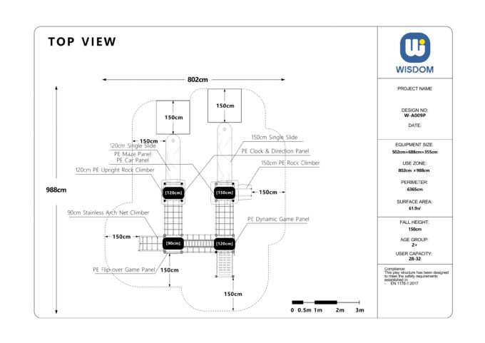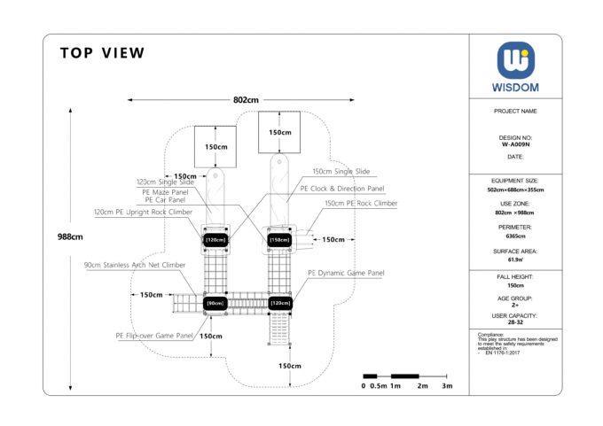- Zertifizierte Sicherheit für sorgenfreies Spielen (TÜV Süd): Trotz ihrer Größe und Komplexität erfüllt die Anlage höchste Sicherheitsanforderungen. Sie ist vom TÜV Süd nach der strengen europäischen Norm EN 1176 zertifiziert. Eine moderate maximale Fallhöhe von 150 cm, rutschfeste Beläge, sichere Aufstiege und eine durchdachte, kollisionsfreie Anordnung aller Elemente gewährleisten ein sicheres Spielumfeld für eine große Anzahl von Kindern.