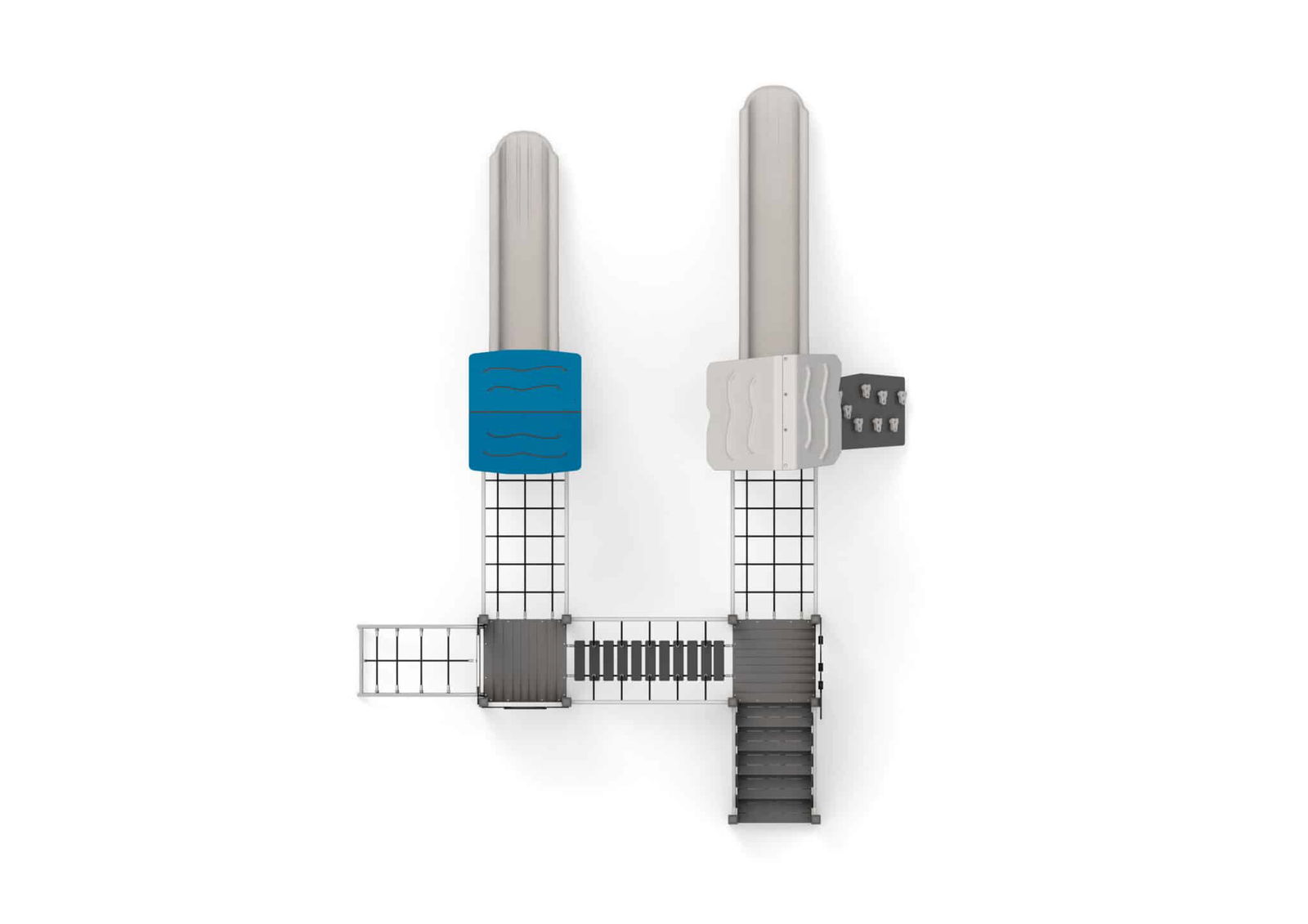Erwecken Sie eine Welt voller Abenteuer mit dieser beeindruckenden und abwechslungsreichen Spielanlage aus der „Wise Kidz“-Stahl-Serie von WISDOM Spielplatzgeräte. Dieses weitläufige Spielsystem wurde für Kinder ab zwei Jahren entwickelt und ist ein wahres Paradies, das körperliche Herausforderungen und kognitive Anreize meisterhaft kombiniert. Mit vier verbundenen Türmen, zwei Rutschen in unterschiedlichen Höhen, einer wackeligen Netzbrücke, einer stabilen Plankenbrücke und einer außergewöhnlichen Vielfalt von fünf interaktiven Spielwänden ist diese Anlage ein Garant für langanhaltenden und abwechslungsreichen Spielspaß. Die massive, vom TÜV Süd zertifizierte Konstruktion aus galvanisiertem Stahl verspricht höchste Sicherheit und Langlebigkeit für unzählige Spielstunden.