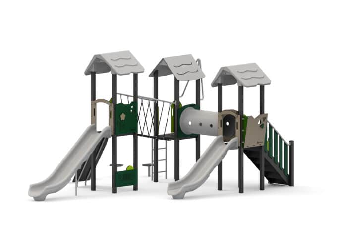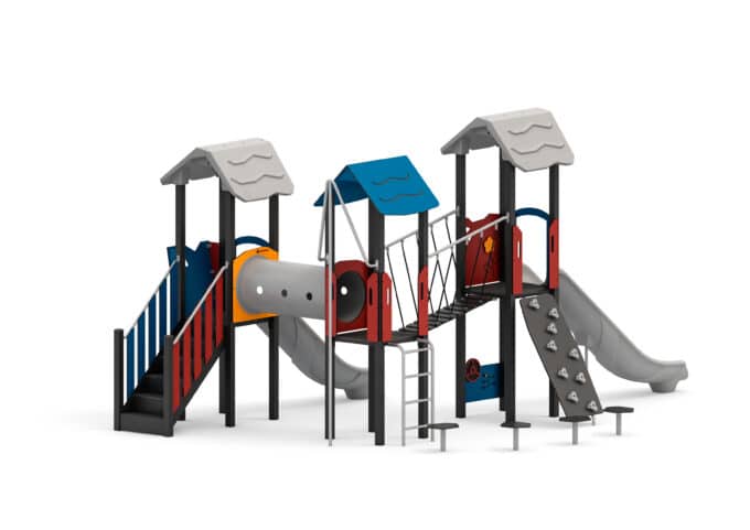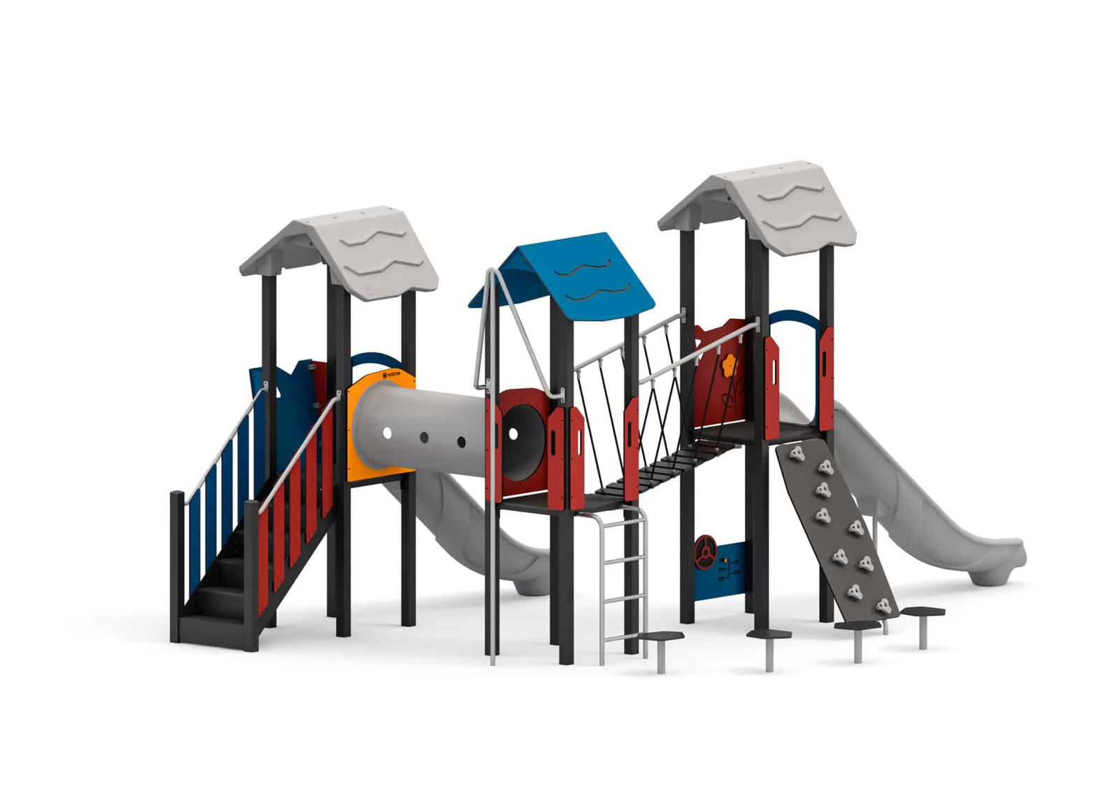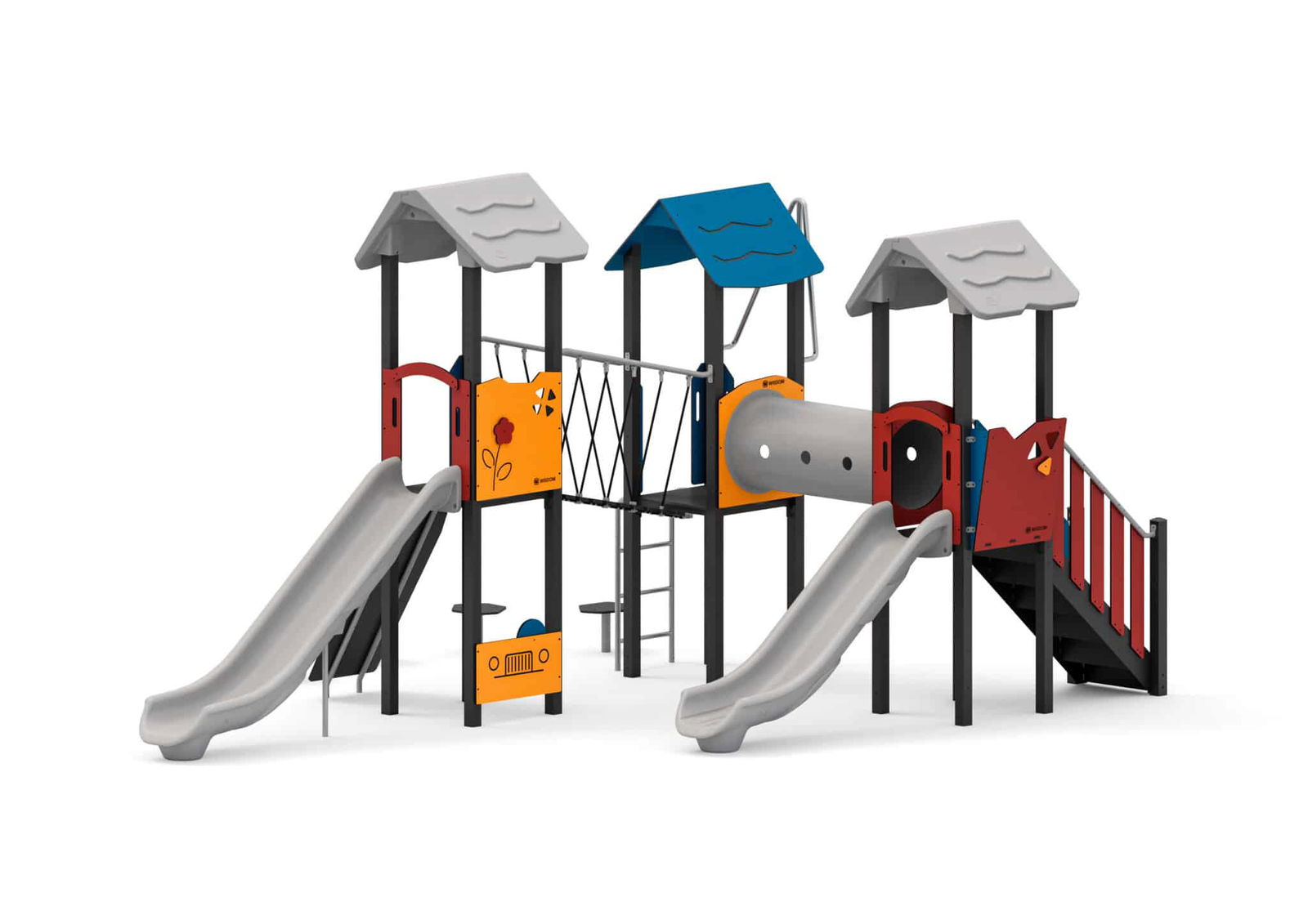 - Produktname: Spielanlage mit 2 Rutschen, Treppe, Kriechtunnel und Kletterwand