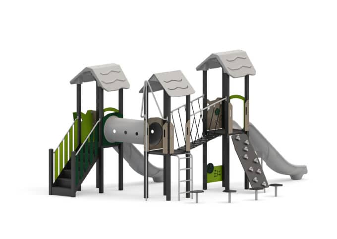 Öffnen Sie die Tore zu einer Welt voller Bewegung und Fantasie mit dieser weitläufigen und abwechslungsreichen Spielanlage aus der „Wise Kidz“-Stahl-Serie von WISDOM Spielplatzgeräte. Dieses beeindruckende Spielsystem wurde für Kinder ab zwei Jahren konzipiert und vereint eine enorme Vielfalt von 11 Aktivitäten zu einem kompletten Abenteuerland. Mit mehreren Türmen, die durch eine aufregende Netzbrücke verbunden sind, zwei Rutschen in unterschiedlichen Höhen, einer großen, geneigten Kletterwand, einem Kriechtunnel und einer sicheren Treppe bietet diese Anlage für jedes Kind die passende Herausforderung. Die extrem robuste, vom TÜV Süd zertifizierte Konstruktion aus galvanisiertem Stahl garantiert höchste Sicherheit und eine außergewöhnliche Langlebigkeit.