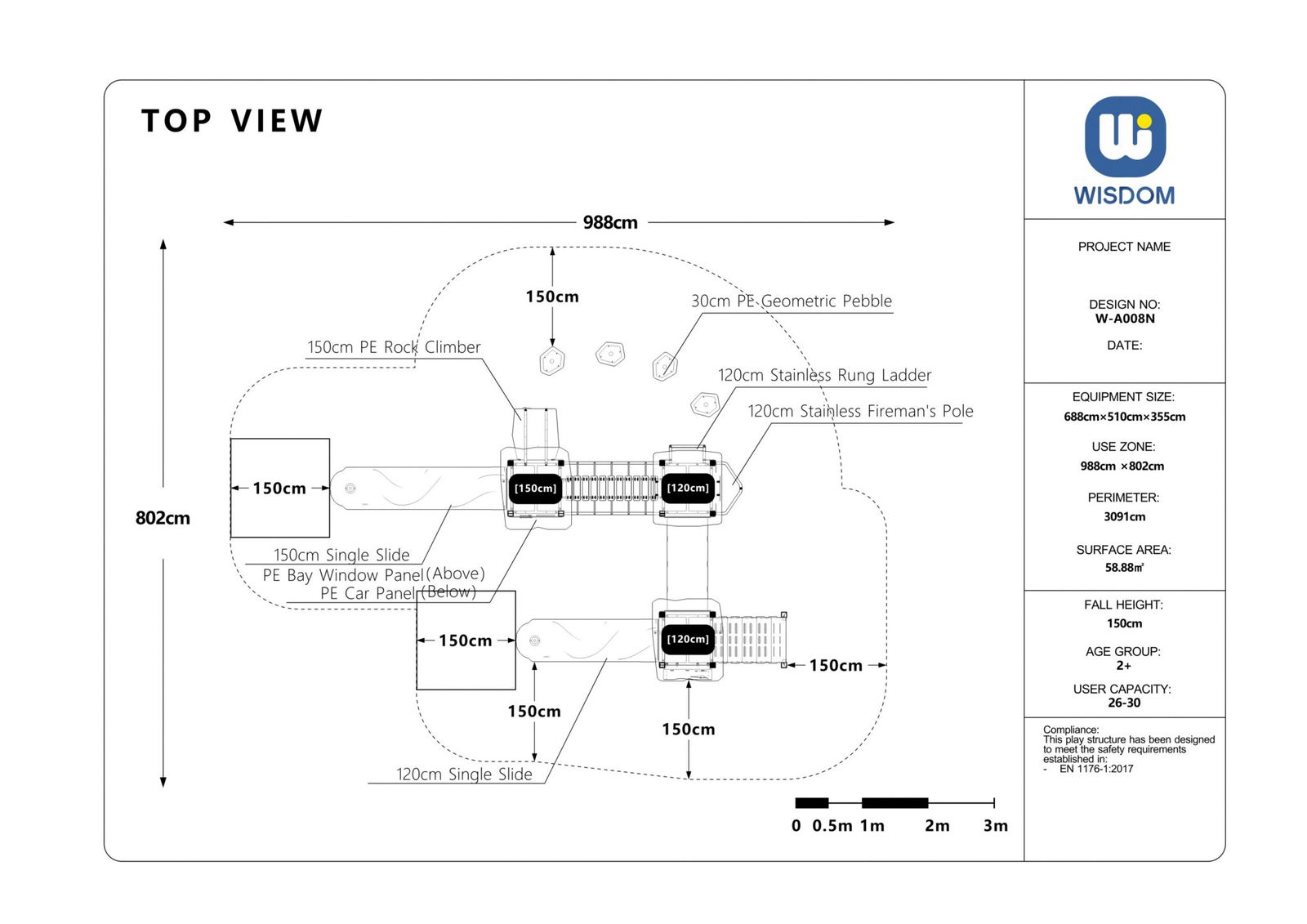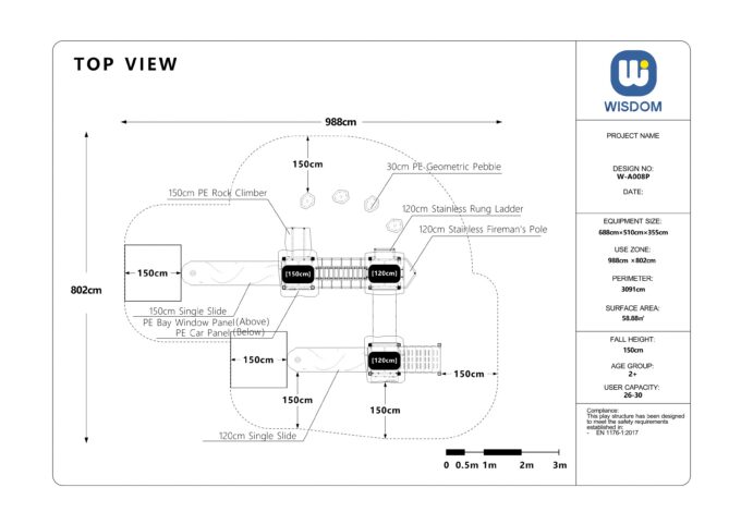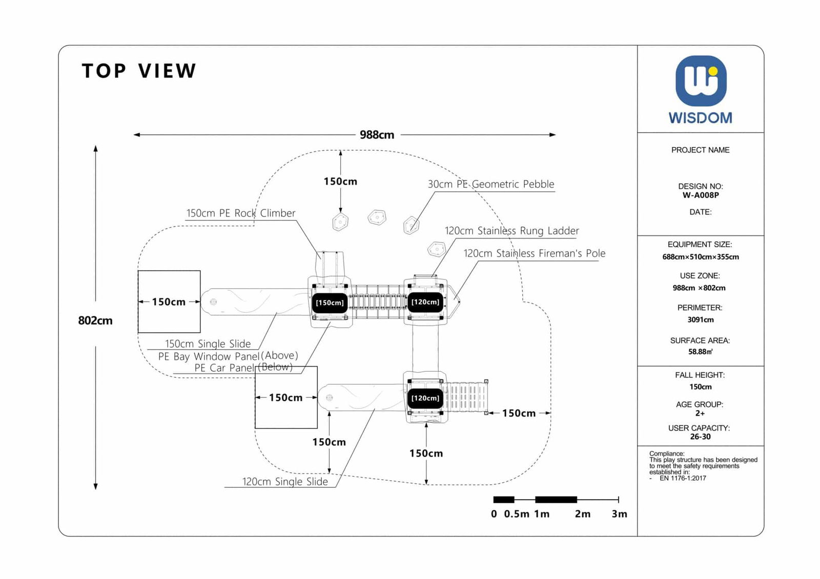 - Zertifizierte Sicherheit für unbeschwertes Vergnügen (TÜV Süd): Trotz ihrer Größe und der vielen Aktivitäten steht die Sicherheit an oberster Stelle. Die gesamte Konstruktion ist vom TÜV Süd nach der strengen europäischen Norm EN 1176 zertifiziert. Eine moderate maximale Fallhöhe von 150 cm, rutschfeste WPC-Beläge auf den Podesten und Stufen sowie eine durchdachte, kollisionsfreie Anordnung aller Elemente gewährleisten ein sicheres Umfeld, in dem Kinder frei und unbeschwert spielen können.