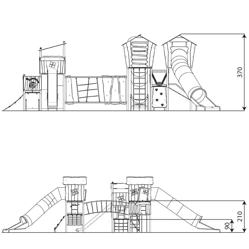 - Plattformen und Kletterwände aus strapazierfähiger, rutschfester und wasserdichter HPL-Platte,