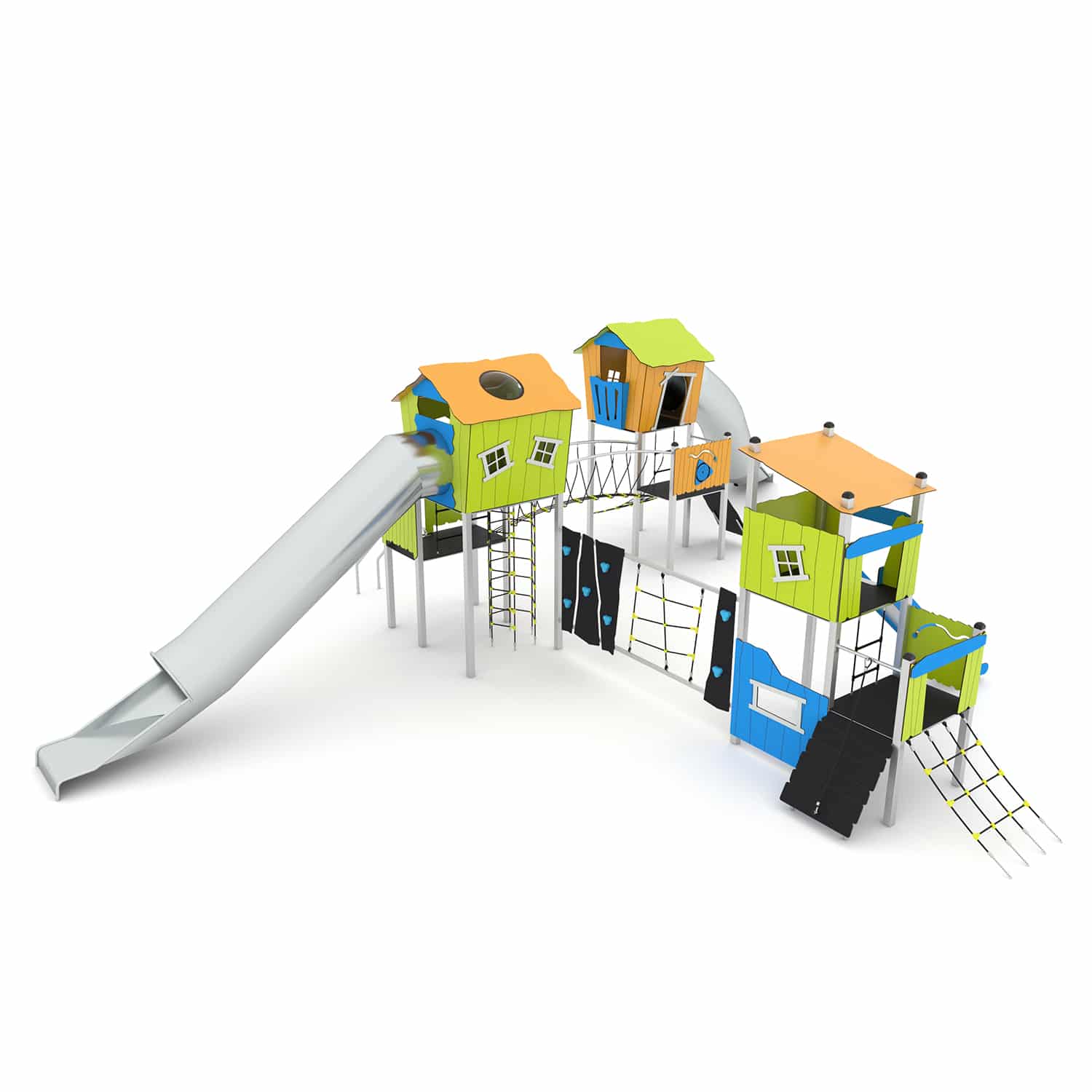 Spielanlage mit 6 Spieltürmen, Rutsche, 2 Röhrenrutschen und Kletterelementen CROOC 0302 von Vinci Play