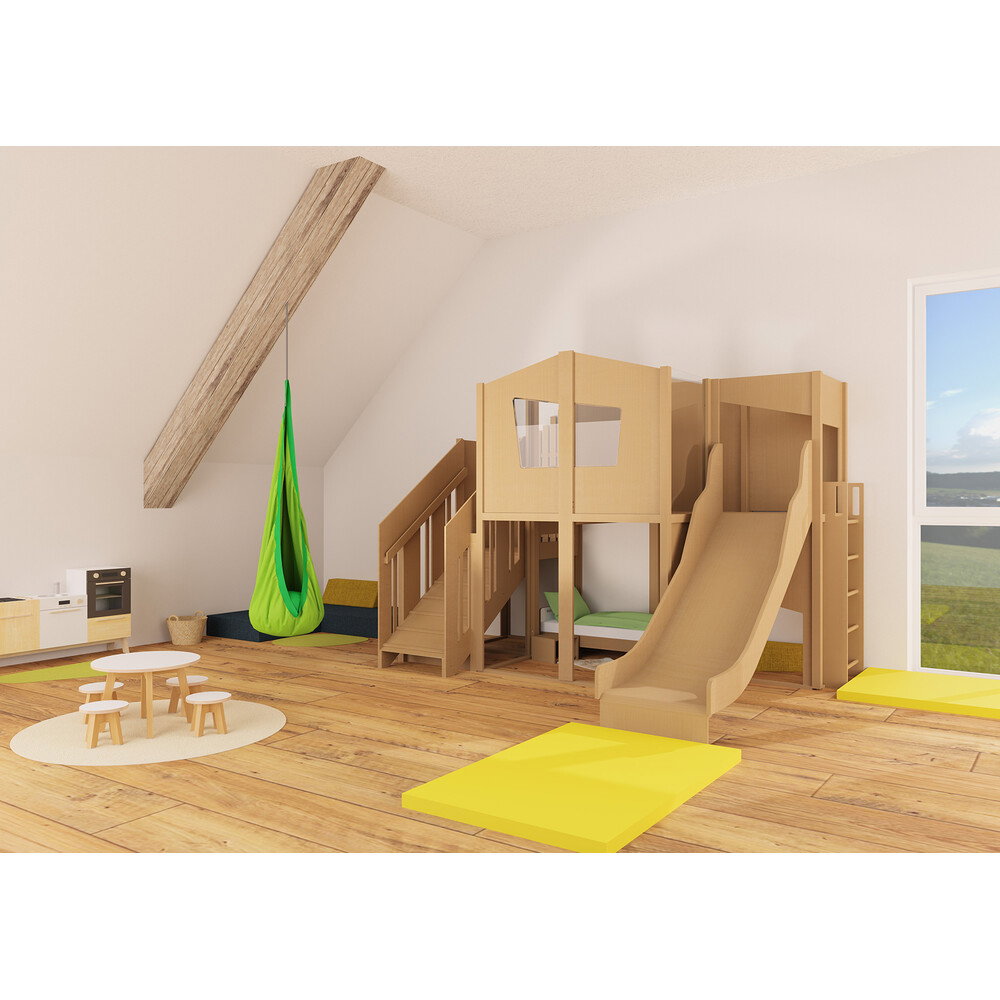 Die intelligente Konstruktion mit einer zweiten Ebene nutzt den Raum optimal aus und verdoppelt die verfügbare Spielfläche. Das schafft Rückzugsorte und Spielbereiche auf unterschiedlichen Höhen, was besonders in Gruppen für eine Entzerrung sorgt und neue Perspektiven eröffnet. - Maximale Sicherheit und zertifizierte Qualität