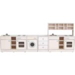 Die Spielkulisse „Bianca“ bietet eine ideale Grundlage für Rollenspiele und besteht aus 13 modularen Einheiten, darunter eine Küchenausstattung und Kleiderschränke. Diese Module können flexibel kombiniert werden, sodass Kinder eine Spielecke ganz nach ihren Vorstellungen gestalten können. Dort ist es möglich, Szenen des Familienalltags nachzuspielen und in verschiedene Rollen zu schlüpfen. Die Möbelelemente sind aus weiß gebeiztem und lackiertem Sperrholz mit einer Stärke von 19 mm angefertigt, was für Qualität und Robustheit steht. Durch sorgfältig verarbeitete Rückseiten sind die Module auch frei im Raum positionierbar. Schutzgleiter aus Kunststoff unter den Möbeln dienen dazu, den Bodenbelag zu schützen.