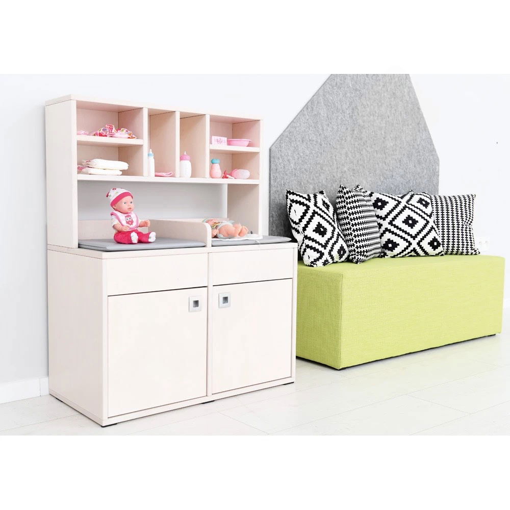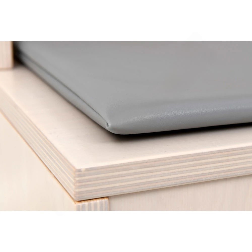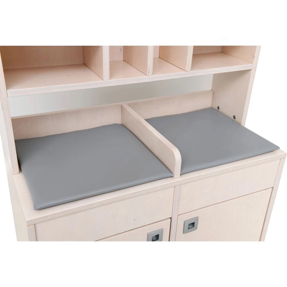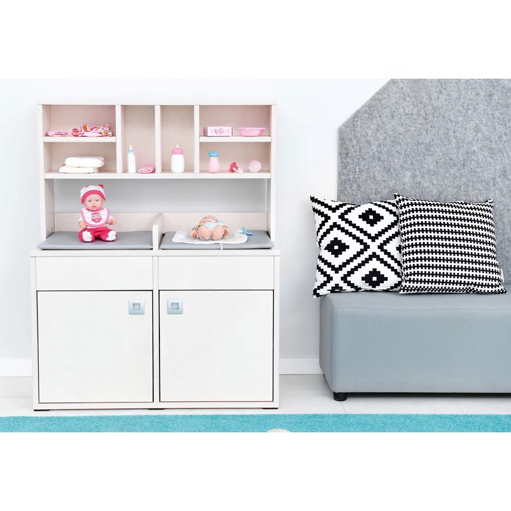 Damit das Spiel sofort beginnen kann, sind zwei passende Wickelauflagen mit pflegeleichtem Kunstlederbezug bereits im Lieferumfang enthalten. Die Arbeitshöhe von 52 cm ist ergonomisch ideal auf die Größe von Kindergartenkindern abgestimmt, sodass sie bequem und ohne Anstrengung spielen können. - Bodenschonend und sicher