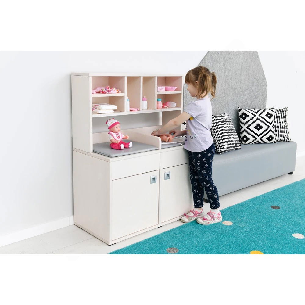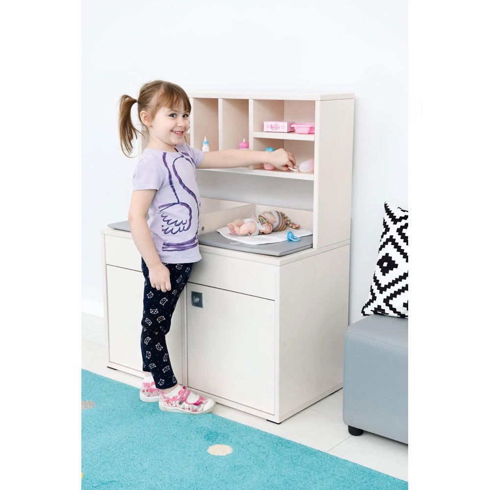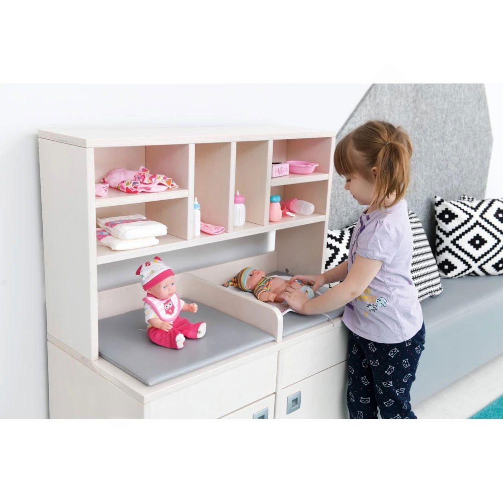 Beim Wickeln, Anziehen und Pflegen ihrer Puppen üben Kinder spielerisch Fürsorge und Verantwortung. Das Modul bietet genug Platz für zwei Kinder, was Kooperation und Kommunikation anregt. Gemeinsam kümmern sie sich um ihre Schützlinge und spielen Alltagssituationen aus dem Familienleben nach. - Exzellente Materialqualität und Stabilität