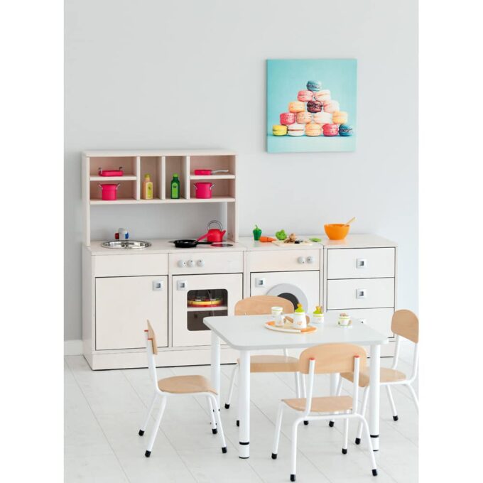 Mit der robusten Konstruktion und der umweltschonenden Lackierung bietet die Küchenzeile 3 eine sichere und langlebige Spielumgebung. Dank der flexiblen Modulbauweise und der verschiedenen Höhen ist sie für jede Spielecke ideal geeignet.